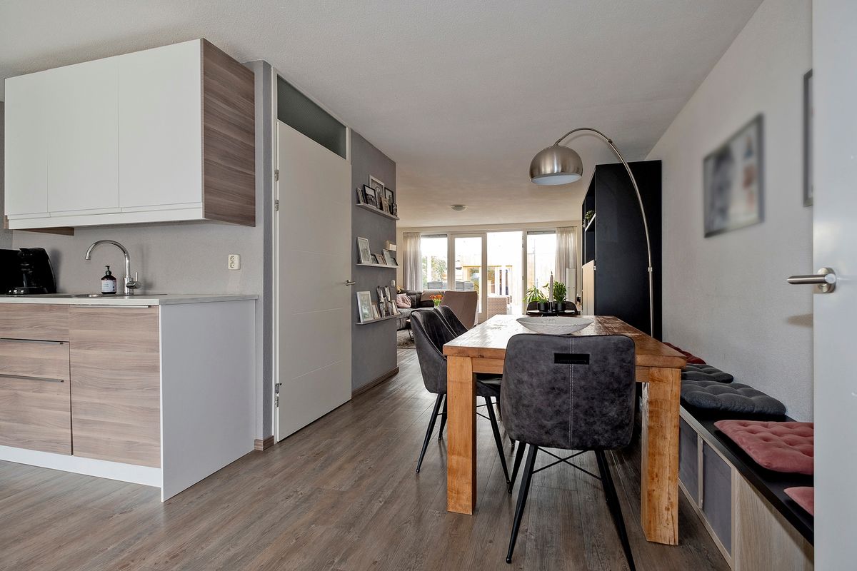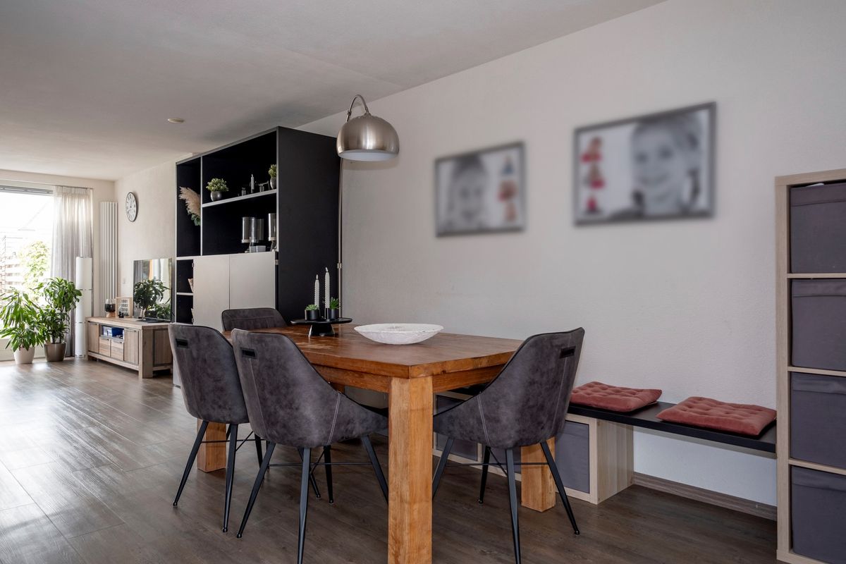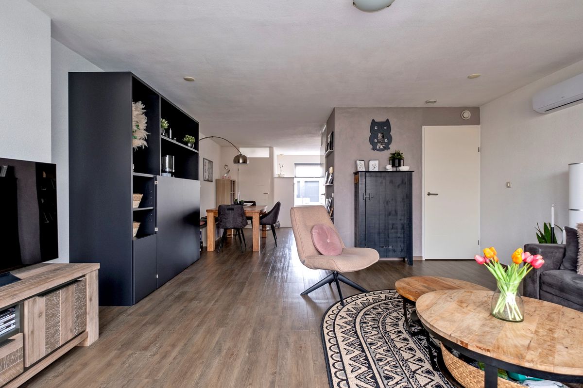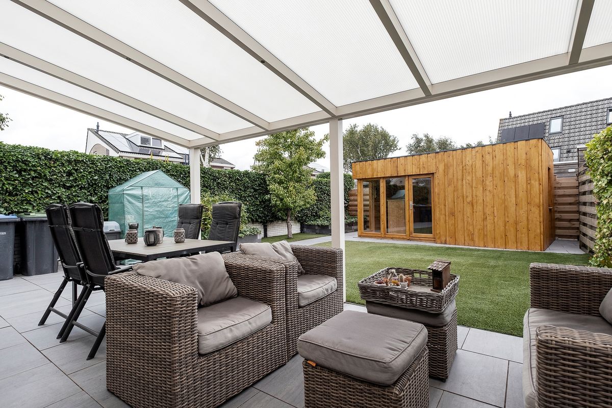 Bij binnenkomst valt de aan de tuinzijde gesitueerde woonkamer direct op. De grote raampartijen zorgen voor een overvloed aan natuurlijk licht en geven een prachtig uitzicht op de achtertuin, die voorzien is van een sfeervolle overkapping en een fraai tuinhuis. Dit is dé plek om te genieten van de buitenlucht, of het nu gaat om een gezellige barbecue met vrienden of een rustige middag met een boek.