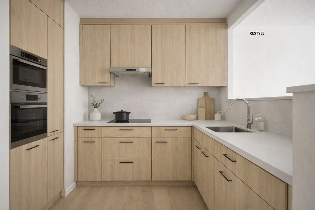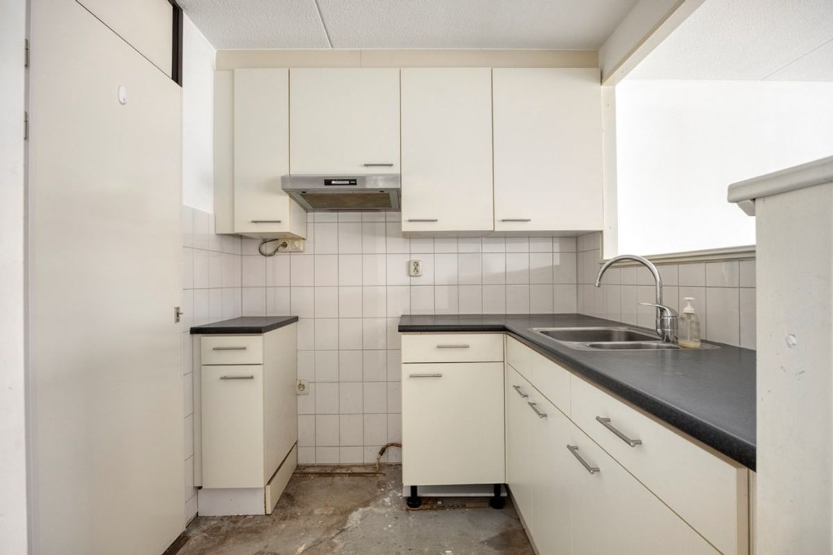 De open keuken sluit naadloos aan op de woonkamer en beschikt over een L-vormig aanrechtblad. De keuken is toe aan vernieuwing en biedt daarmee een uitstekende basis voor het plaatsen van moderne inbouwapparatuur en het creëren van een eigentijdse keukenopstelling. Er is voldoende opbergruimte aanwezig in de lades en kastjes. De berging praktische berging naast de keuken biedt gemak in het dagelijks gebruik.