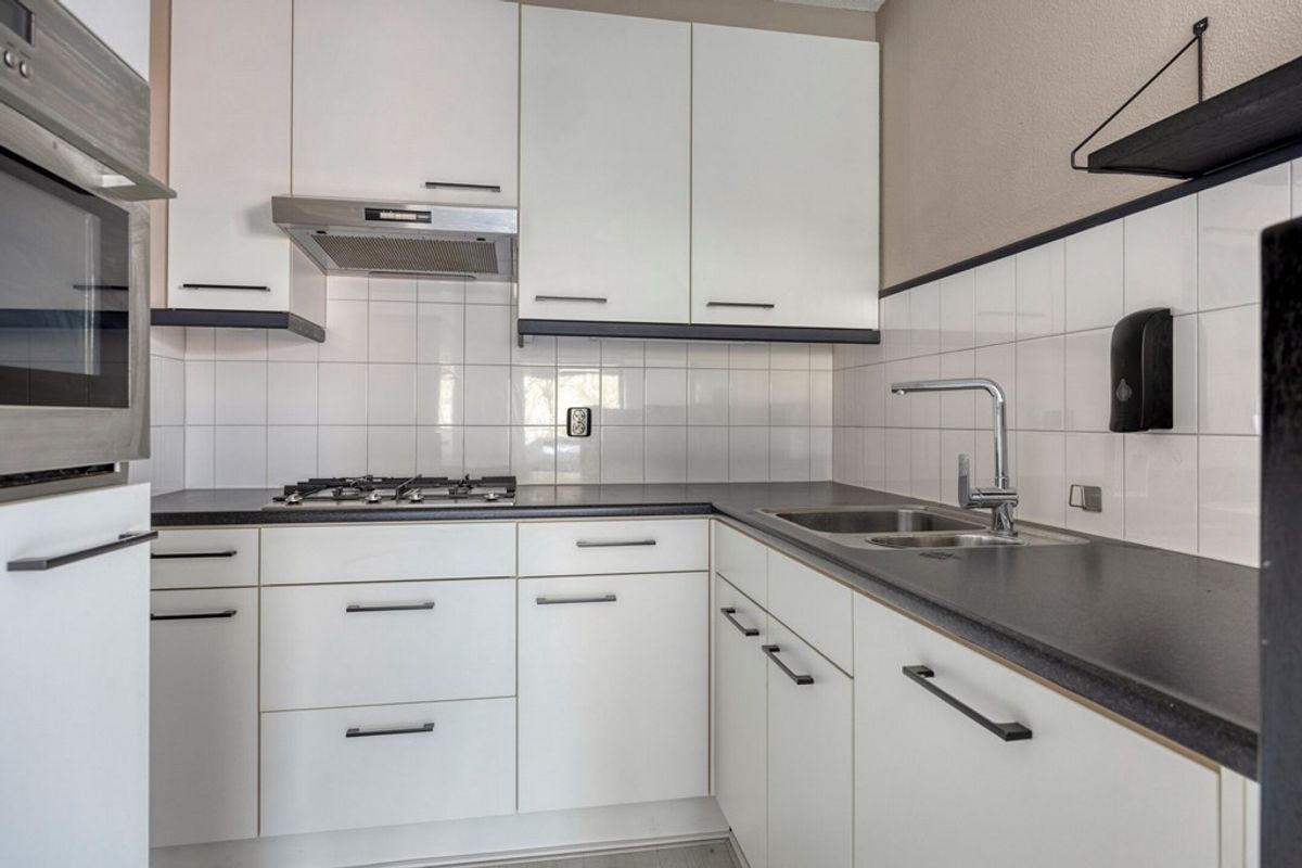 De woonkamer ligt aan de achterzijde van het appartement en is opvallend ruim opgezet. Dankzij de grote ramen en de deur naar het balkon valt hier veel daglicht binnen. De lichte vloer geven de ruimte een frisse uitstraling en bieden een goede basis voor verschillende woonstijlen. Vanuit de woonkamer kijkt u vrij weg richting het groen in de omgeving en de molen van Rhenen. De keuken staat in open verbinding met de woonkamer en is uitgevoerd in een praktische L-opstelling. De keuken beschikt over diverse kast- en werkruimte en is voorzien van onder andere een gaskookplaat, afzuigkap, combi-oven, vaatwasser.