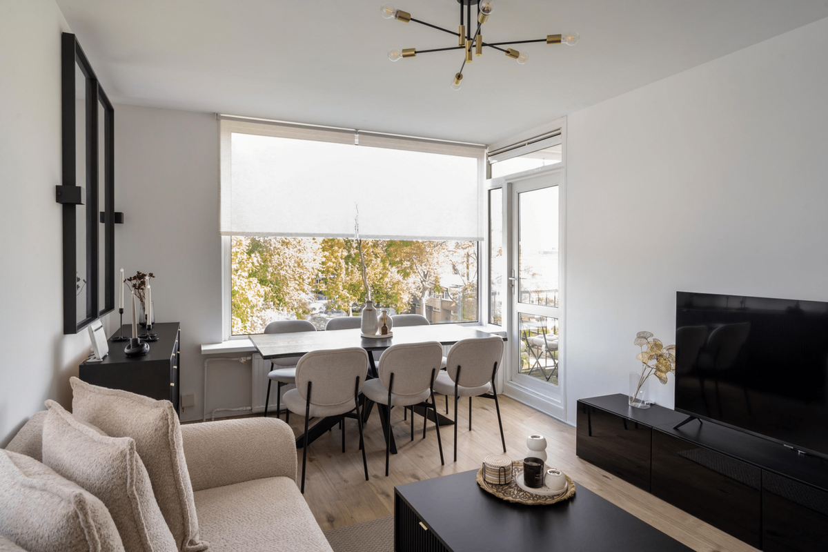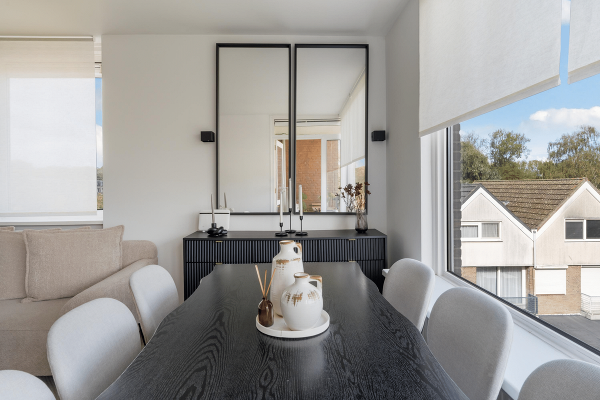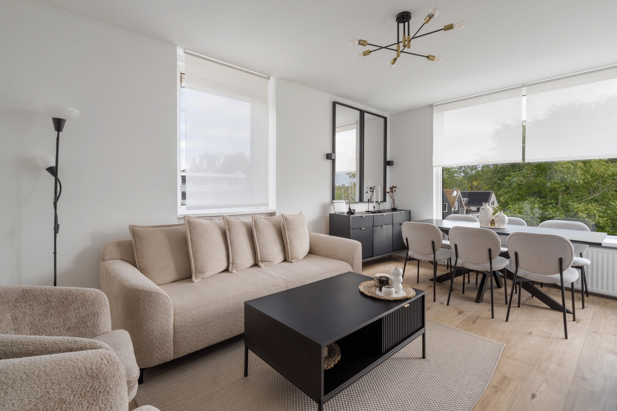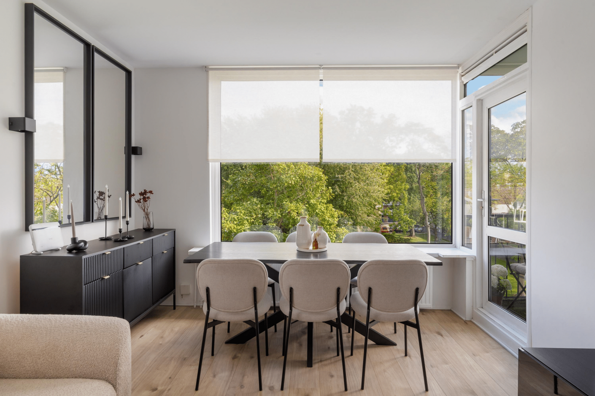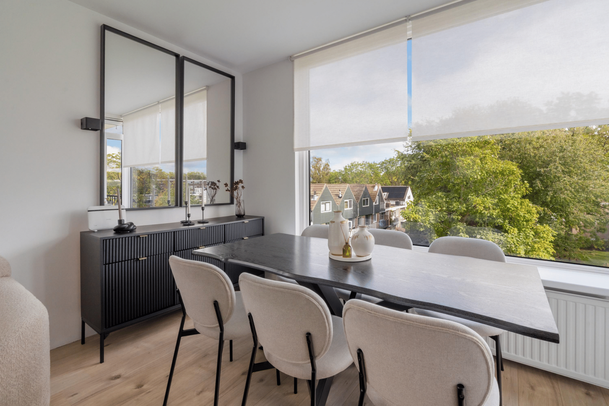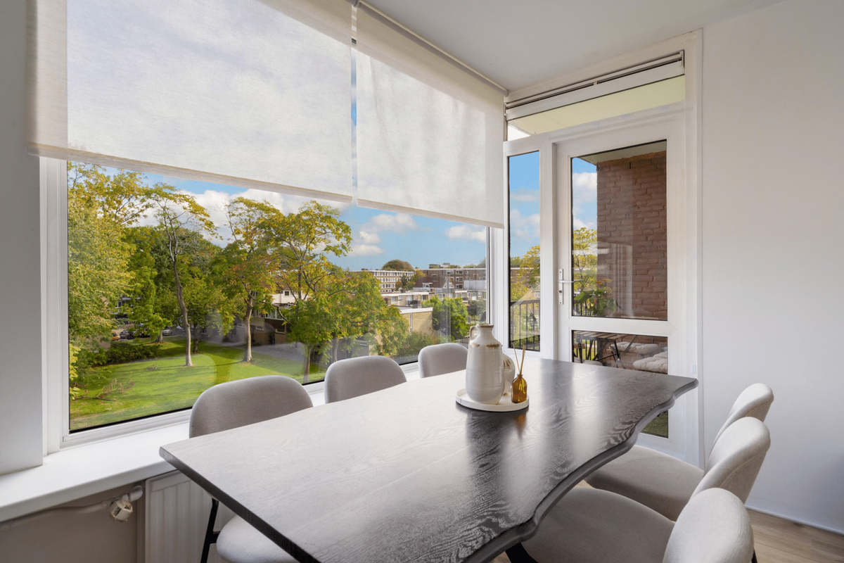 Ruime woon-/eetkamer met toegang tot het balkon op het oosten.