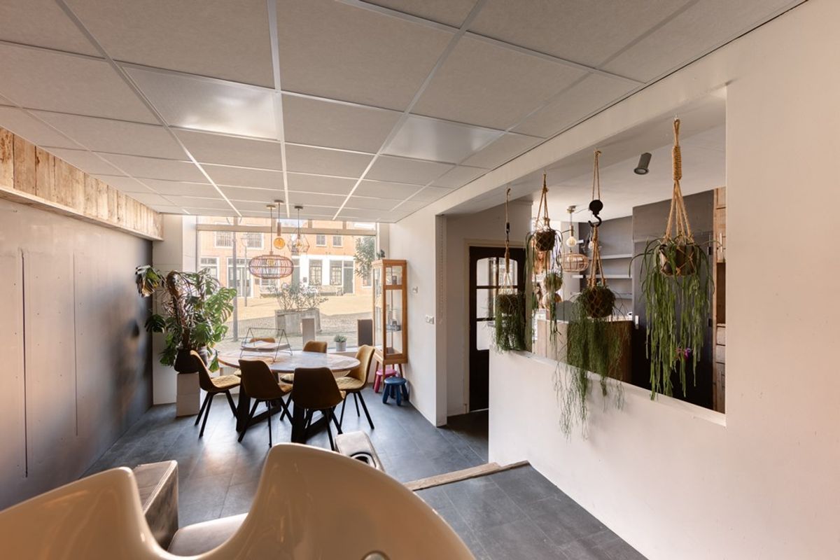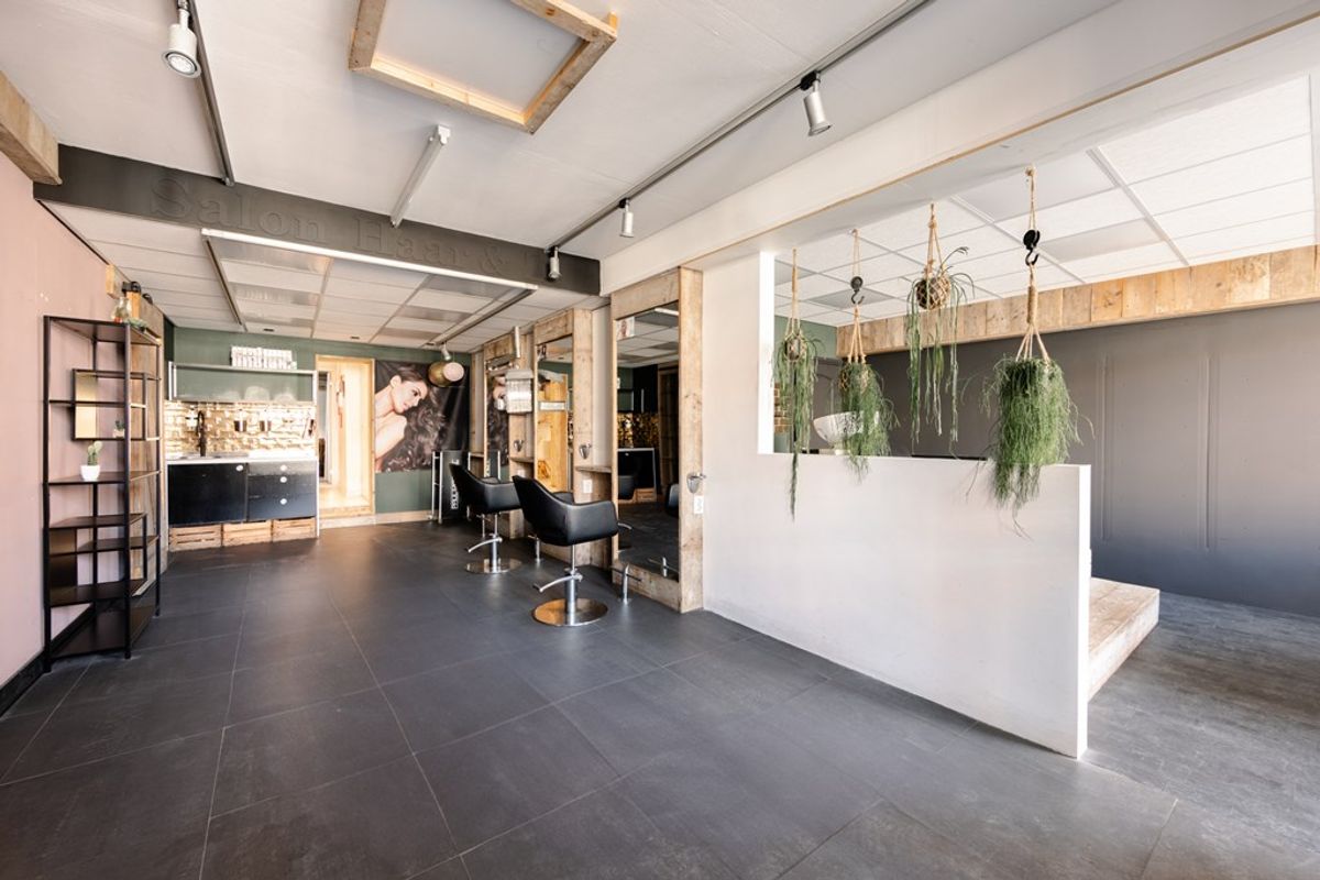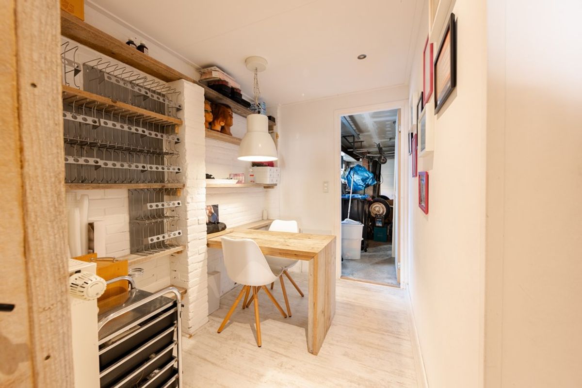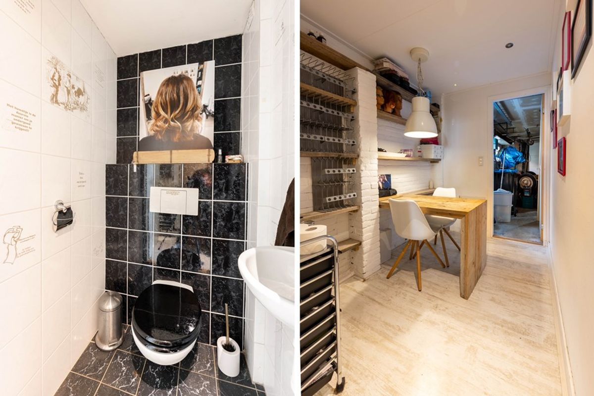 Bij binnenkomst kom je via een halletje in de voormalige kapperszaak, compleet met een kantoortje, toilet en pantry. Vanuit hier loop je binnendoor naar de achteringang, waar je een inpandige garage en bijkeuken met wasmachineaansluiting aantreft.