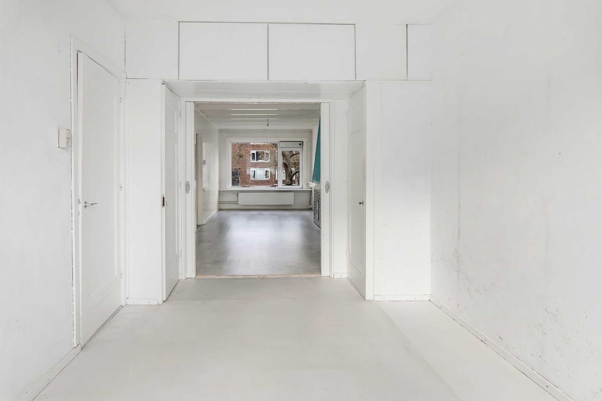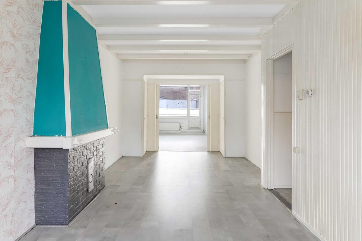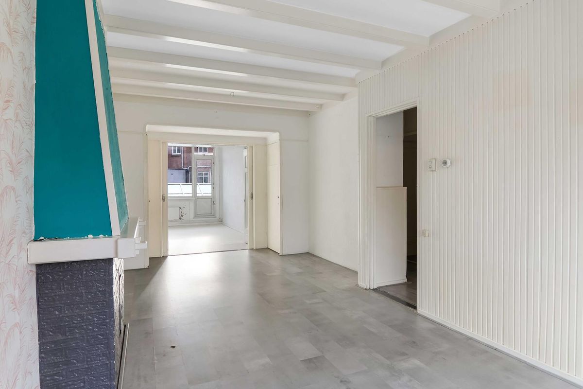 Eerste etage: Entree, hal met toegang tot de diverse vertrekken, waaronder toiletruimte en badkamer. Ook toegang tot de gesloten keuken met eenvoudig keukenblok en balkon, aan de voorzijde gesitueerd. Hiernaast de riante woonkamer met groot raam en daarmee veel lichtinval. Aan de achterzijde van de woonkamer, en gescheiden door schuifdeuren, bevindt zich nog een ruimte die kan worden gebruikt als eetkamer of in te richten is als slaap of studeerkamer.