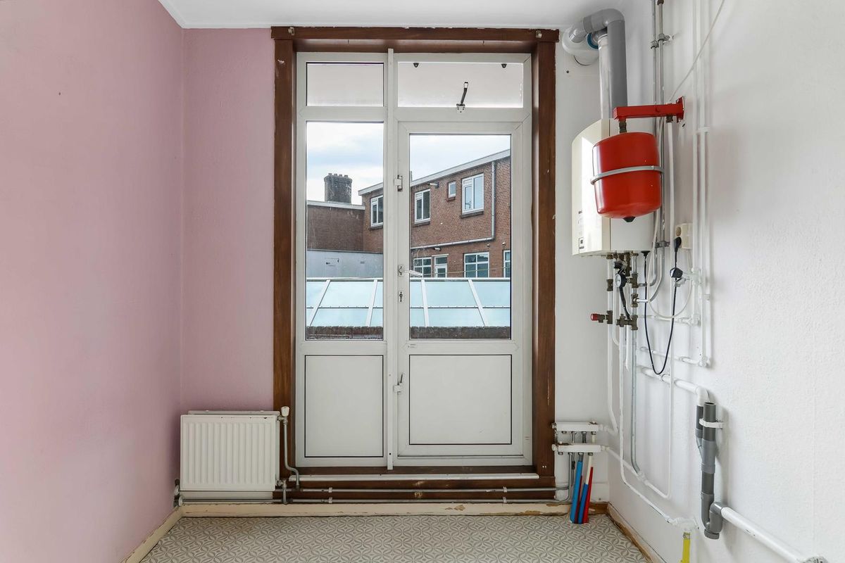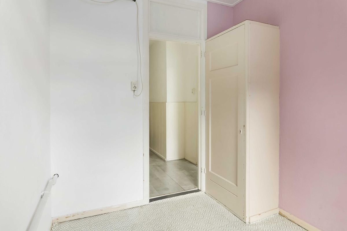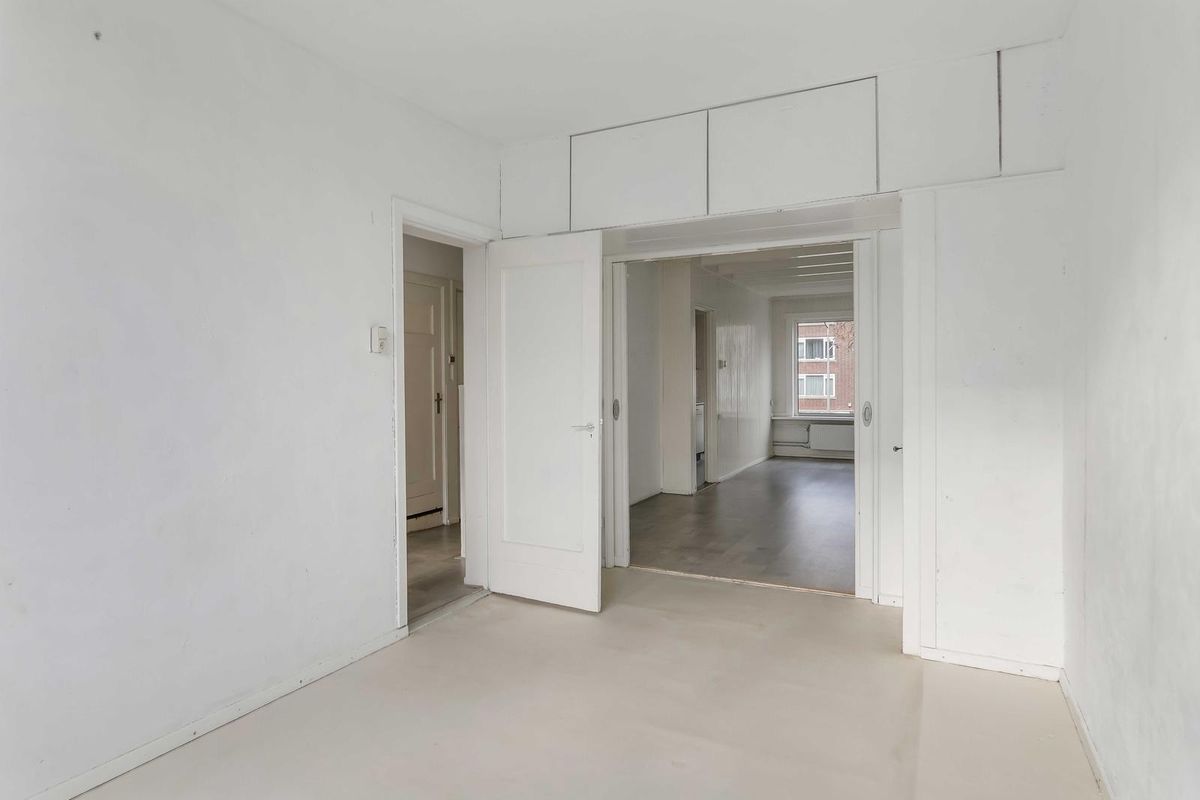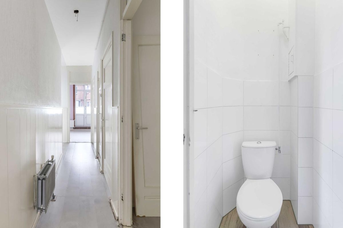Eerste etage: Entree, hal met toegang tot de diverse vertrekken, waaronder toiletruimte en badkamer. Ook toegang tot de gesloten keuken met eenvoudig keukenblok en balkon, aan de voorzijde gesitueerd. Hiernaast de riante woonkamer met groot raam en daarmee veel lichtinval. Aan de achterzijde van de woonkamer, en gescheiden door schuifdeuren, bevindt zich nog een ruimte die kan worden gebruikt als eetkamer of in te richten is als slaap of studeerkamer.