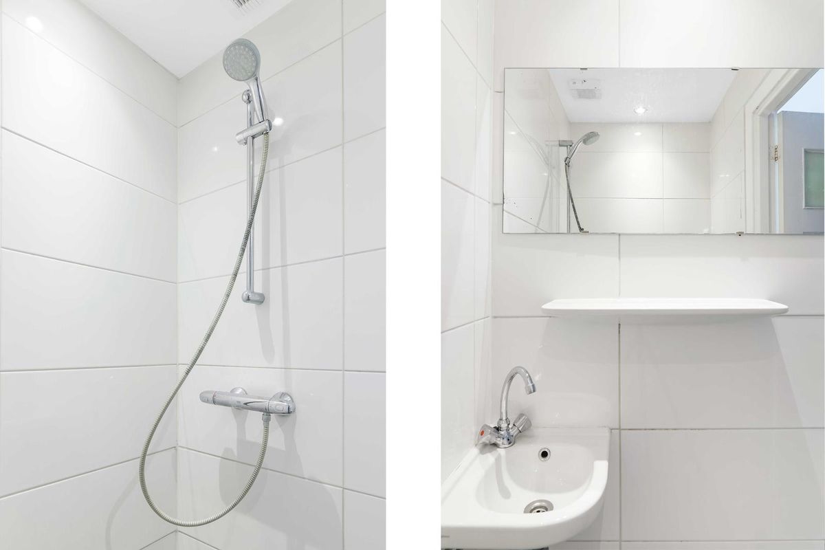 De badkamer (met douche en wastafel) en het toilet zijn netjes uitgevoerd.