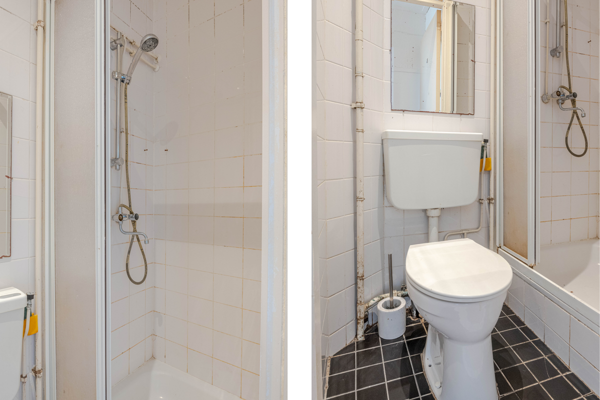 * Badkamer voorzien van lichte betegeling, douchecabine en de toilet.