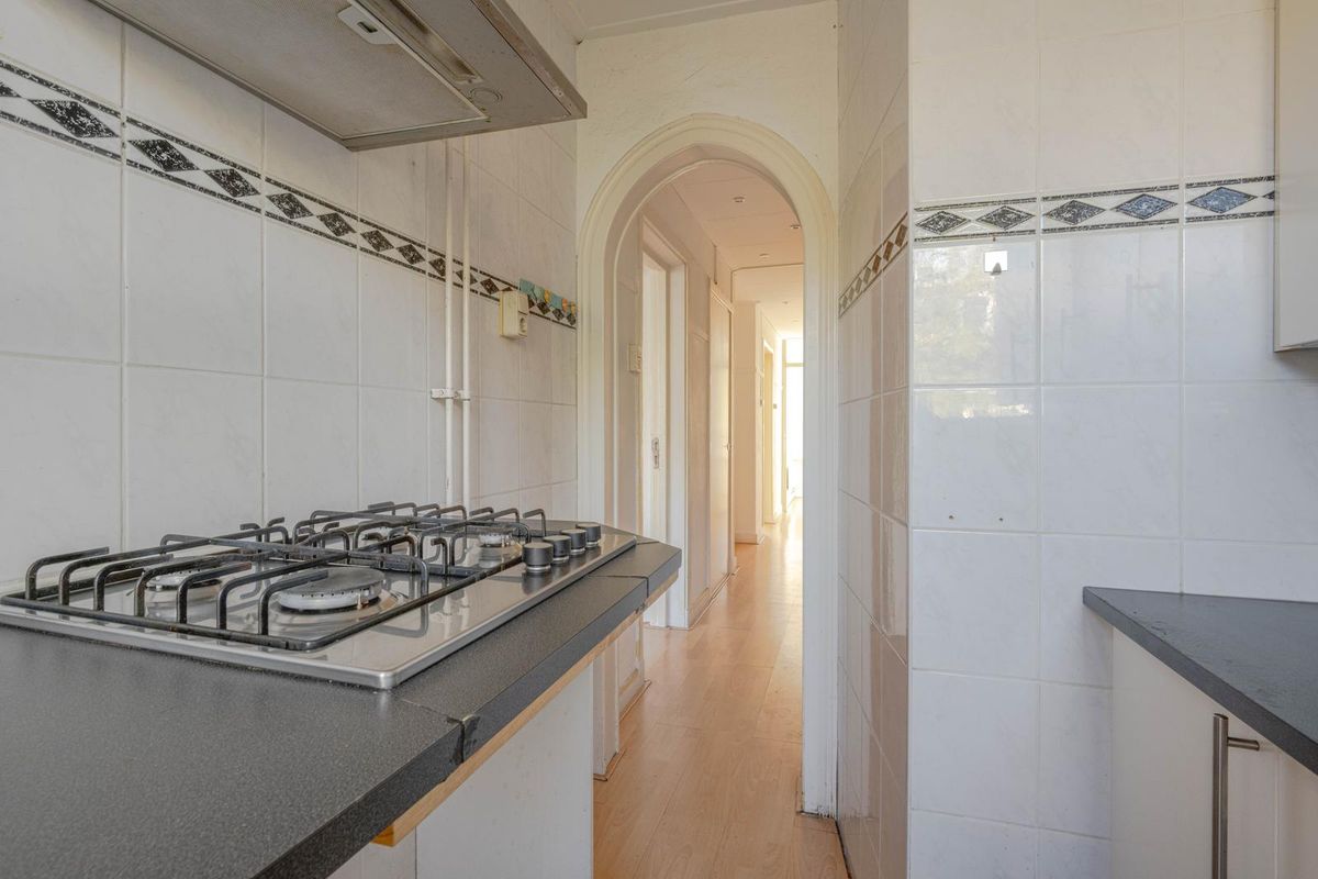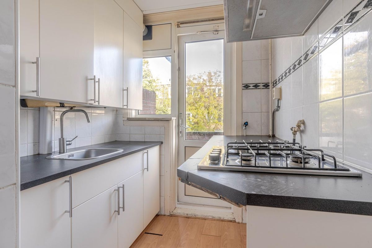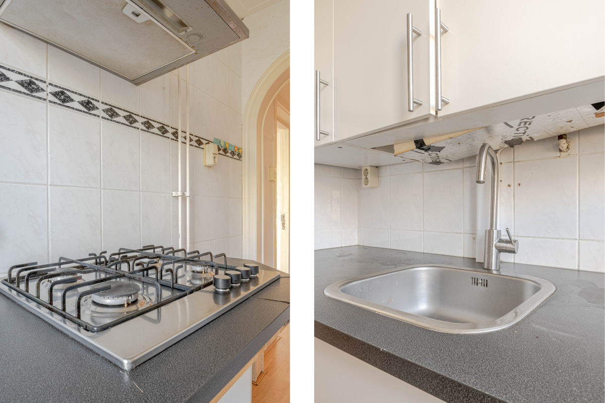 * Keukenruimte aan de achterzijde voorzien van betegelde wanden, laminaatvloer en een dubbele keukenopstelling met een gaskookplaat, afzuigkap, opstelling van de C.V.-combiketel en een deur naar het balkon.