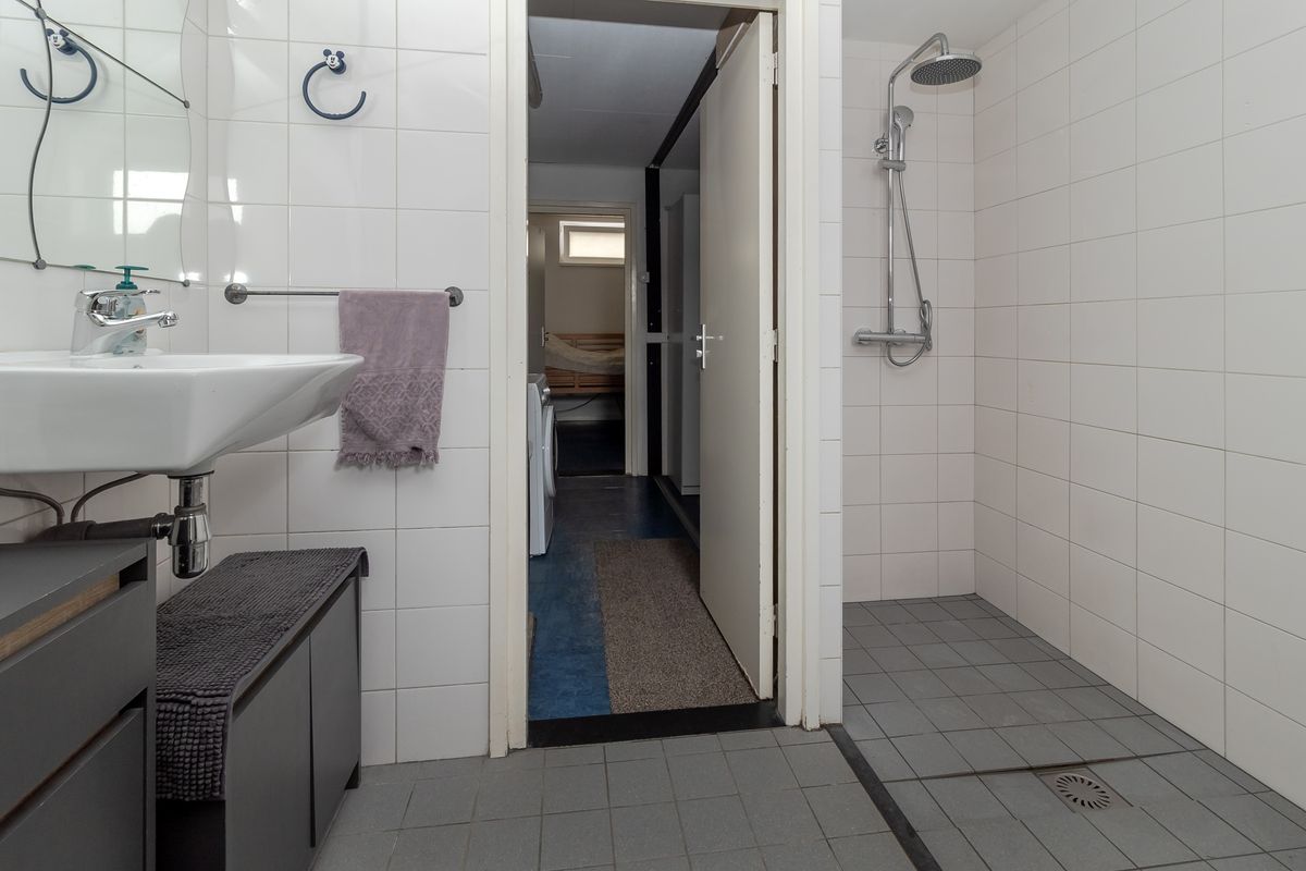 • De badkamer (circa 5,5 m2) is geheel betegeld en voorzien van een douche en een wastafel.