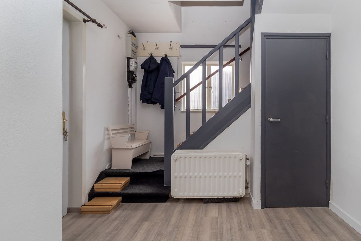 • Entree met trapopgang naar de eerste verdieping, toegang tot de provisiekelder, zekeringenkast en geheel betegelde toiletruimte met duoblok.