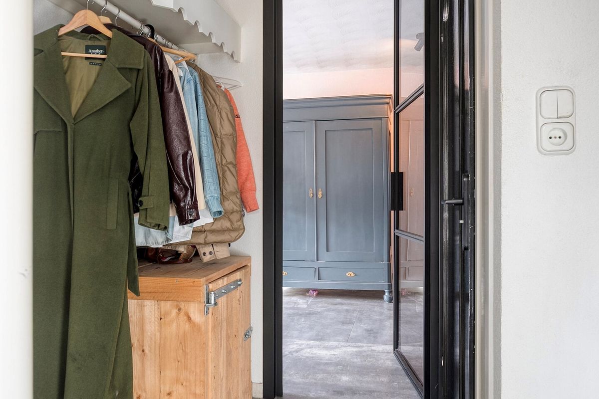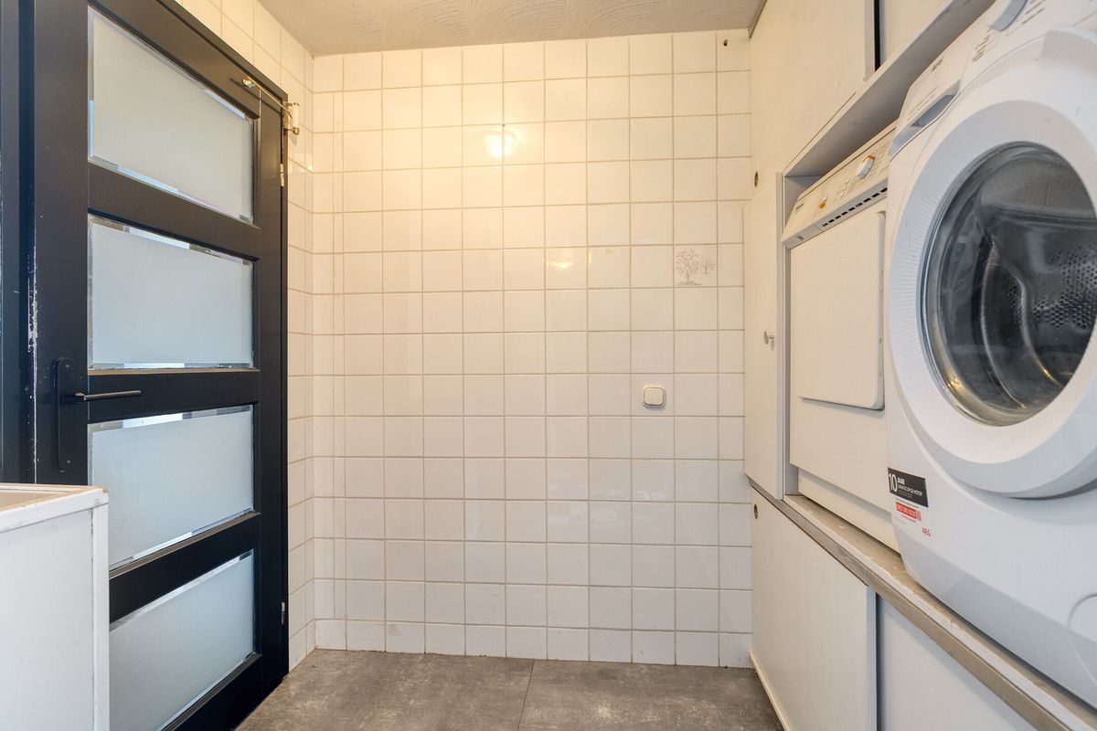 Aansluitend bevindt zich de praktische bijkeuken met wasmachine- en drogeraansluiting (wasmachine op hoogte), ruime bergkasten en toegang tot de inpandige garage. De garage is voorzien van een sauna, extra bergkasten en een inloopdeur naar de sfeervolle achtertuin met veranda.