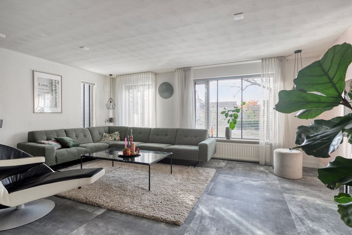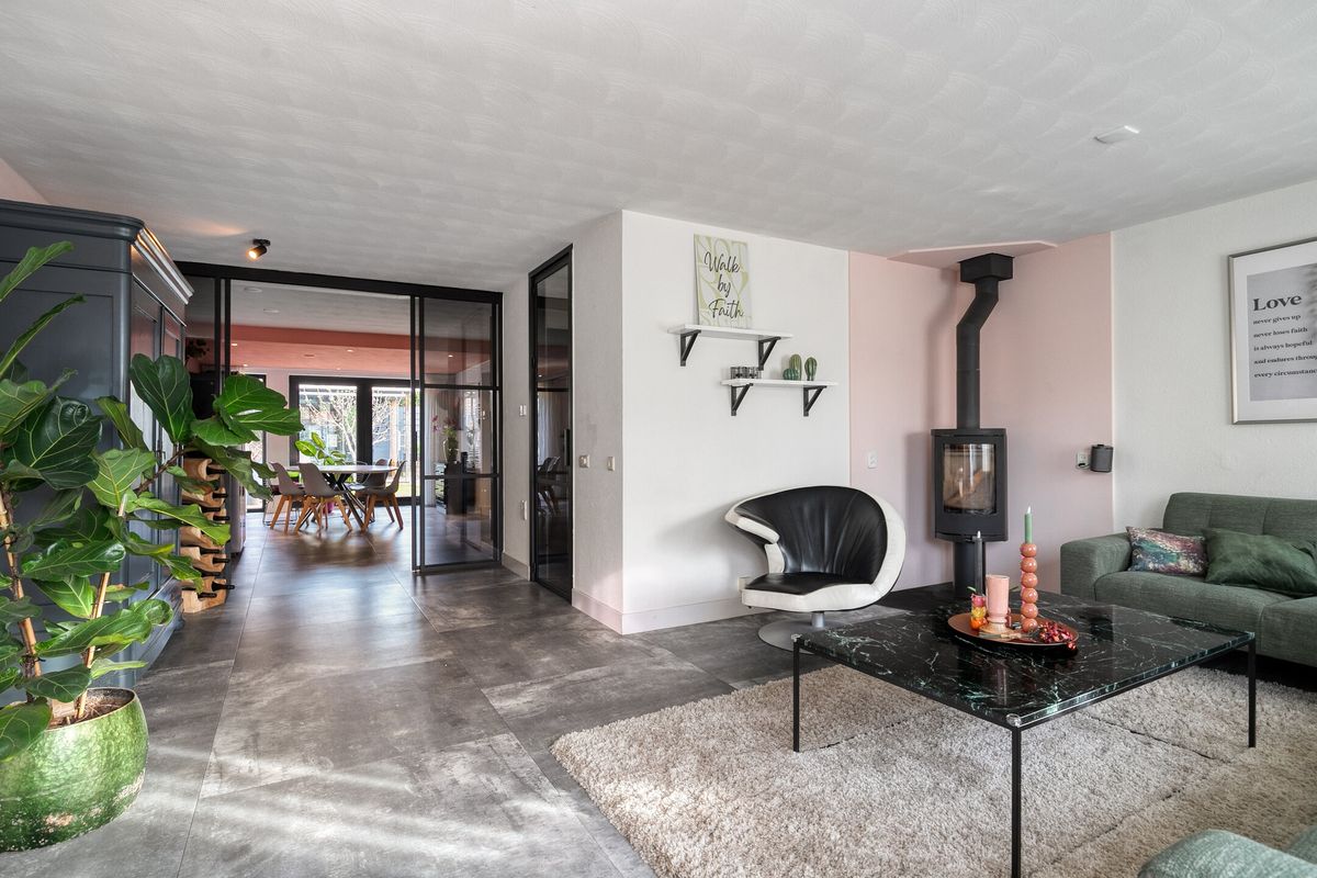 De woonkamer, gelegen aan de voorzijde van de woning, ademt sfeer dankzij de mooie pvc-vloer met grote tegels en vloerverwarming, en een sfeervolle allesbrander. Via stijlvolle stalen schuifdeuren is er toegang tot de royale woonkeuken.
