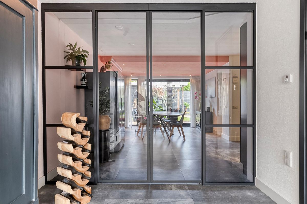 De begane grond is modern en sfeervol afgewerkt met een PVC-vloer in grote tegels, vloerverwarming en stijlvolle stalen taatsdeuren. De royale woonkeuken vormt het hart van de woning en is uitgerust met moderne inbouwapparatuur en een schuifpui naar de achtertuin. De ruime bijkeuken en inpandige garage met sauna maken het wooncomfort compleet.