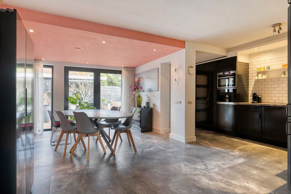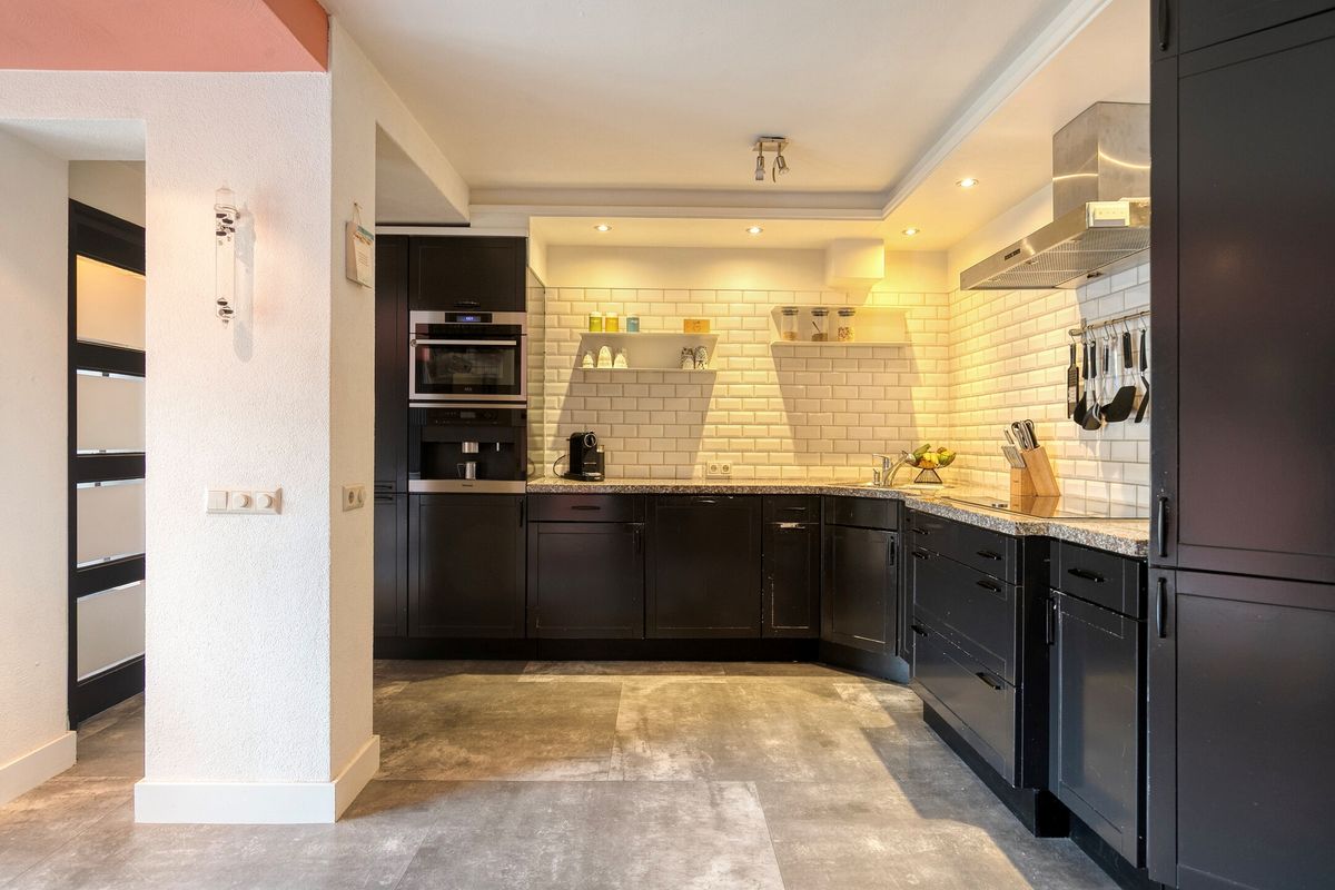 De woonkeuken vormt het hart van het huis: hier is ruimte voor een grote eettafel en volop licht dankzij de schuifpui naar de achtertuin. De keuken is uitgevoerd in een royale hoekopstelling en voorzien van moderne inbouwapparatuur, waaronder een inductiekookplaat, afzuigkap, vaatwasser, combi-oven, koelkast en een ingebouwd koffieautomaat.