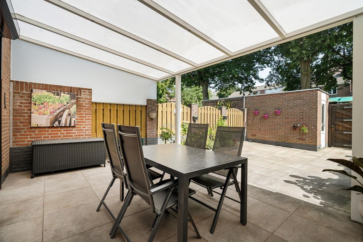 - Volledig betegelde achtertuin met overkapping, berging en achterom;