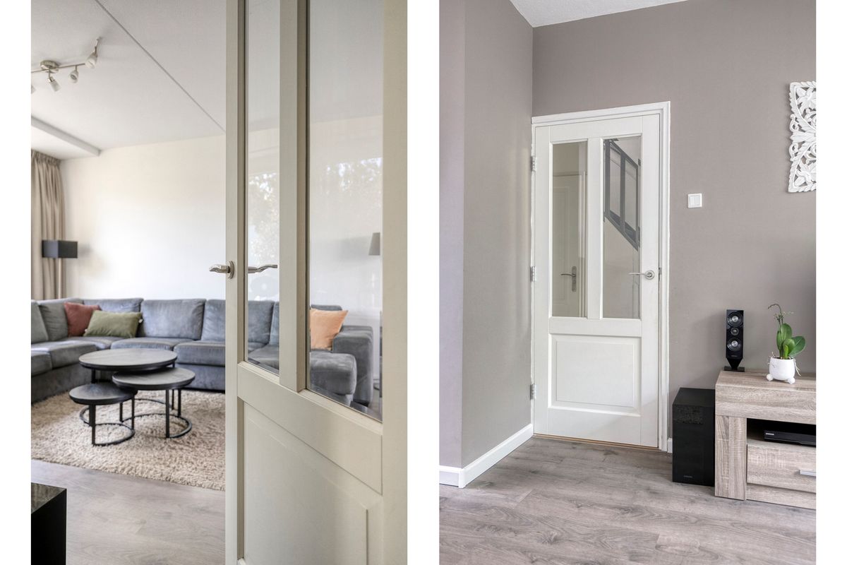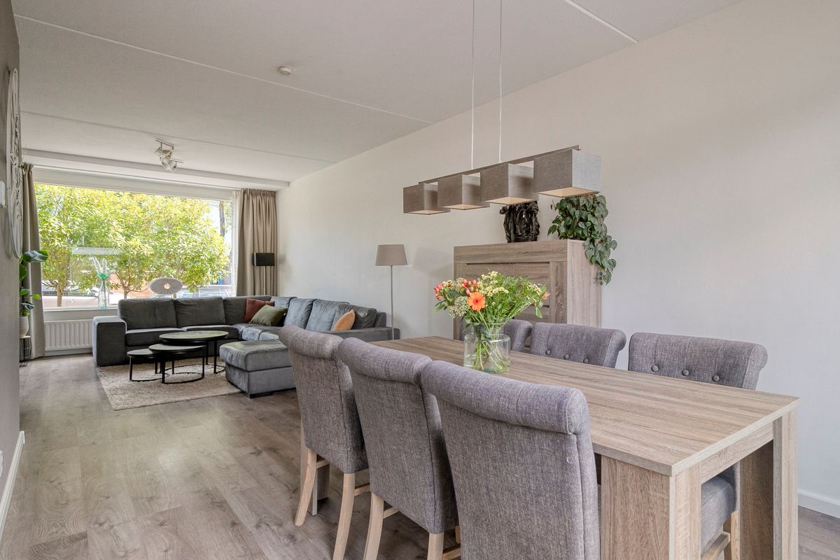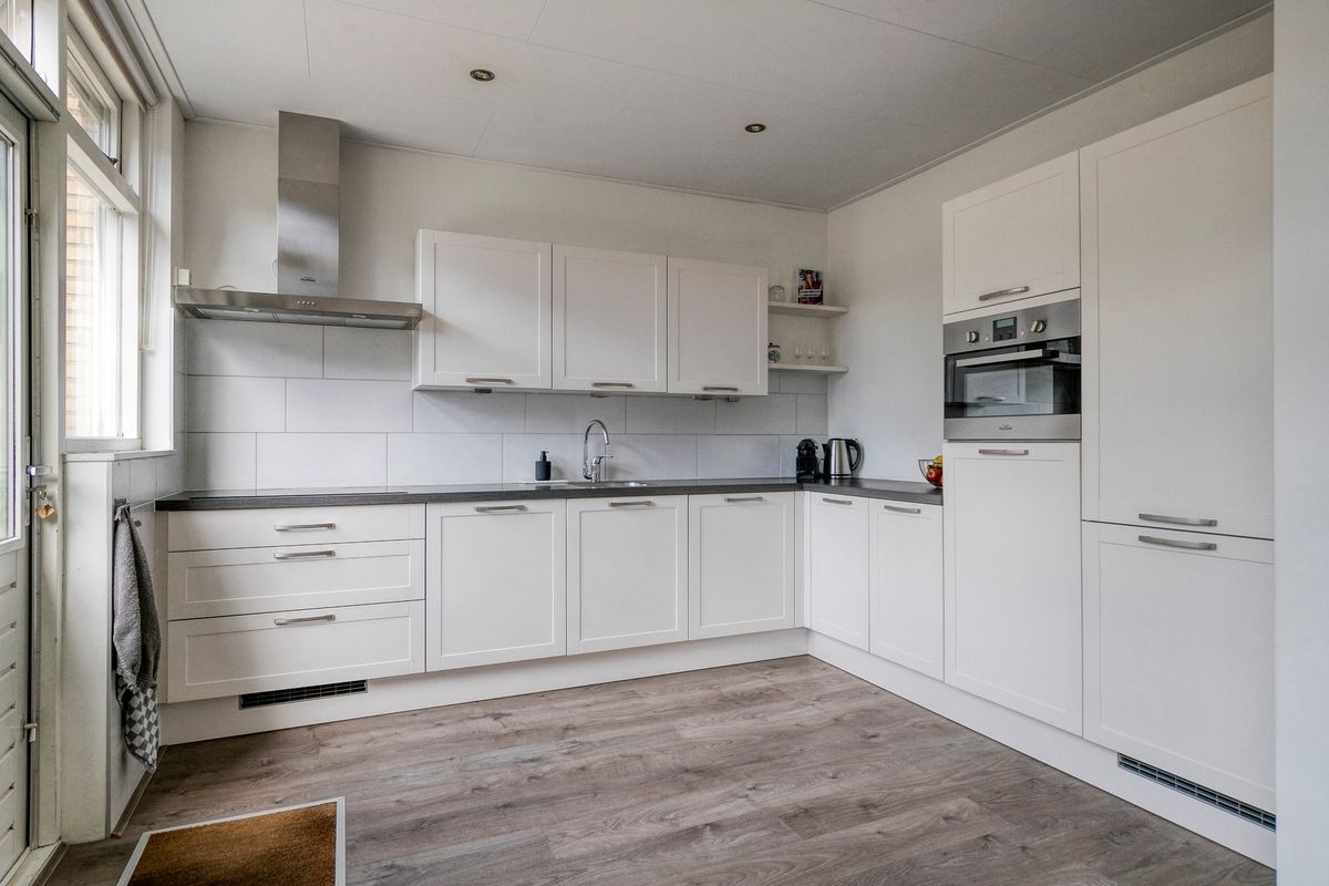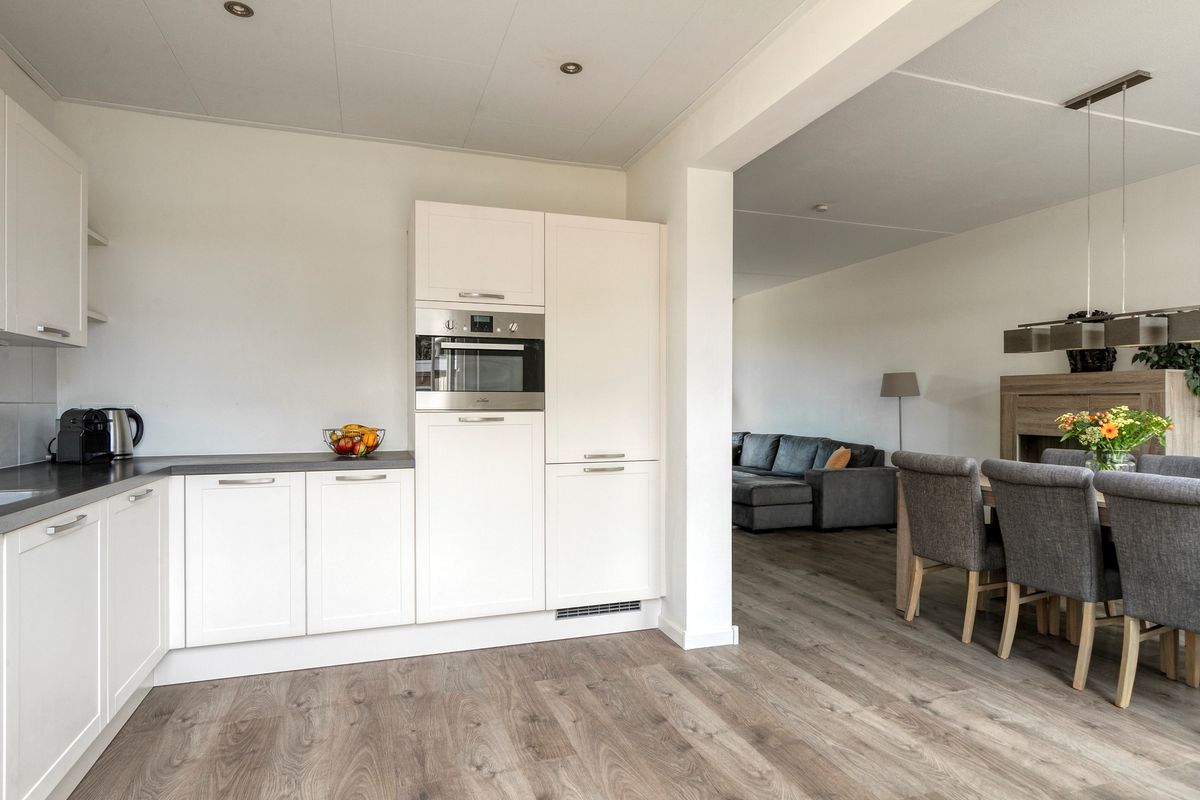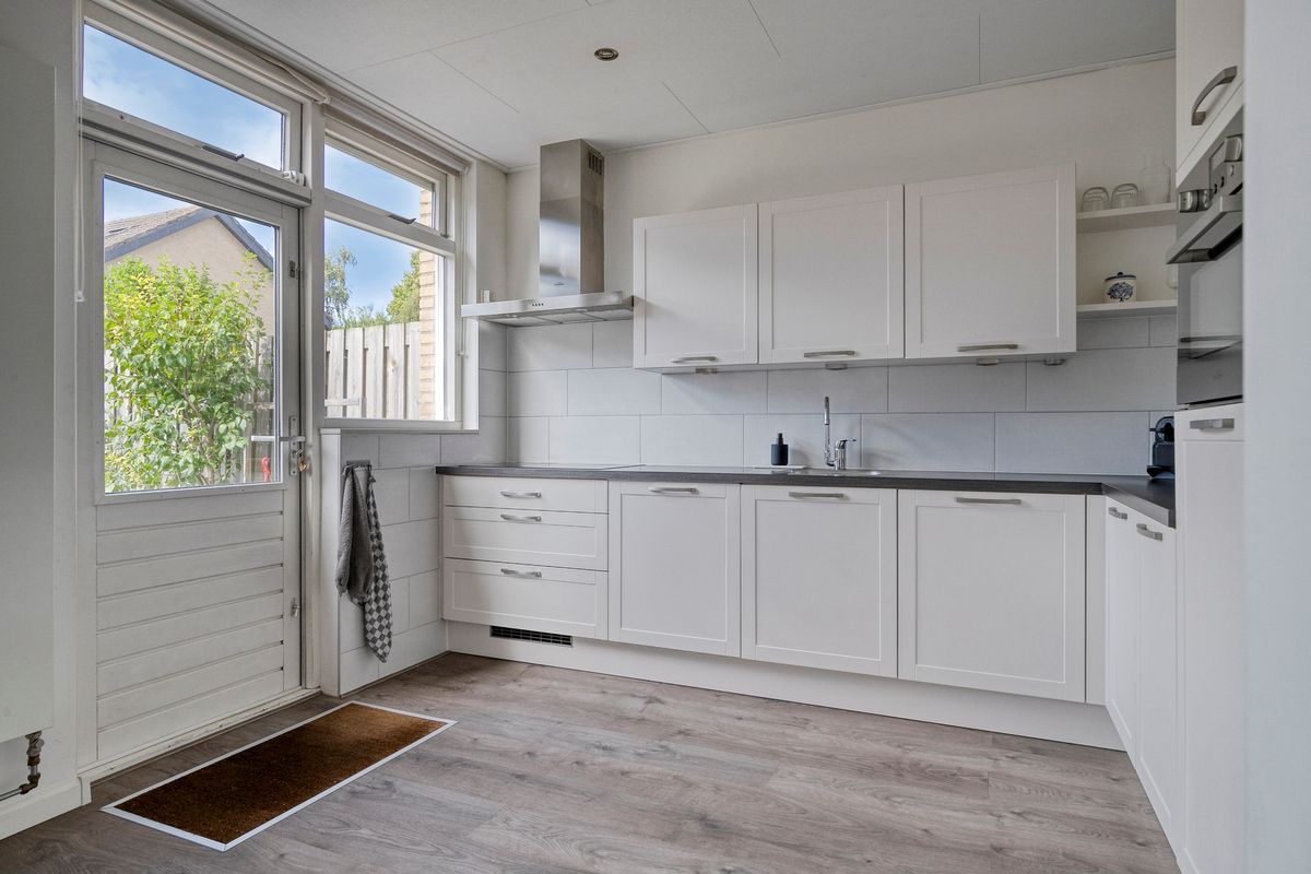Kom binnen! De lichte woonkamer is ruim opgezet en heeft grote raampartijen waardoor je elk seizoen geniet van daglicht. Stel je voor: ‘s ochtends zonnestralen bij je ontbijt en ’s avonds sfeervol samen spelletjes doen aan de eettafel. Dankzij de praktische indeling is er plek genoeg voor een riante hoekbank, speelhoek of bijvoorbeeld een werkplekje. Koken doe je met plezier in de keuken, die grenst aan de tuin – dus terwijl de kids hun energie kwijt kunnen buiten, houd jij ze makkelijk in de gaten.