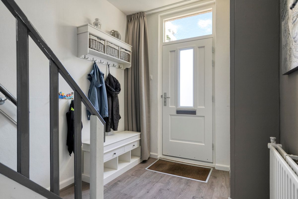 Prettige binnenkomst van de woning in deze ruim opgezette hal. De jassen kunnen makkelijk worden opgehangen zonder dat je er dwars doorheen loopt. De handige vaste kast zorgt voor berging van de stofzuiger en de schoenen. De hal geeft toegang tot de woonkamer, het toilet, de meterkast en de trapopgang.