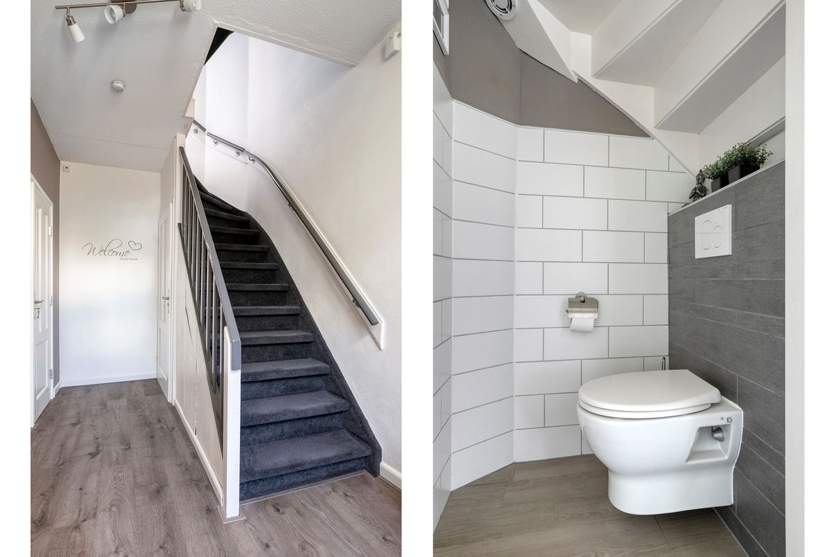 Keurige toilet welke onder de trap is gesitueerd. De neutraal afgewerkte toiletruimte is voorzien van een wandcloset.