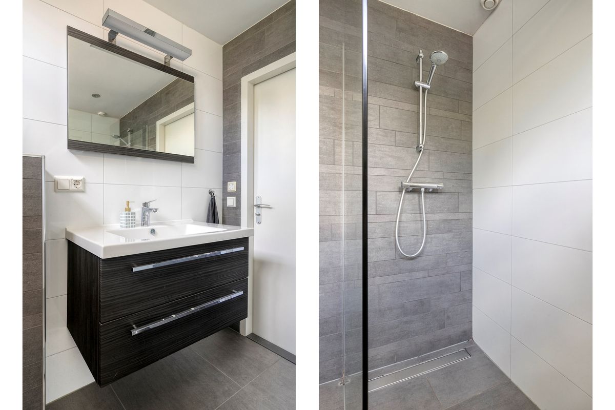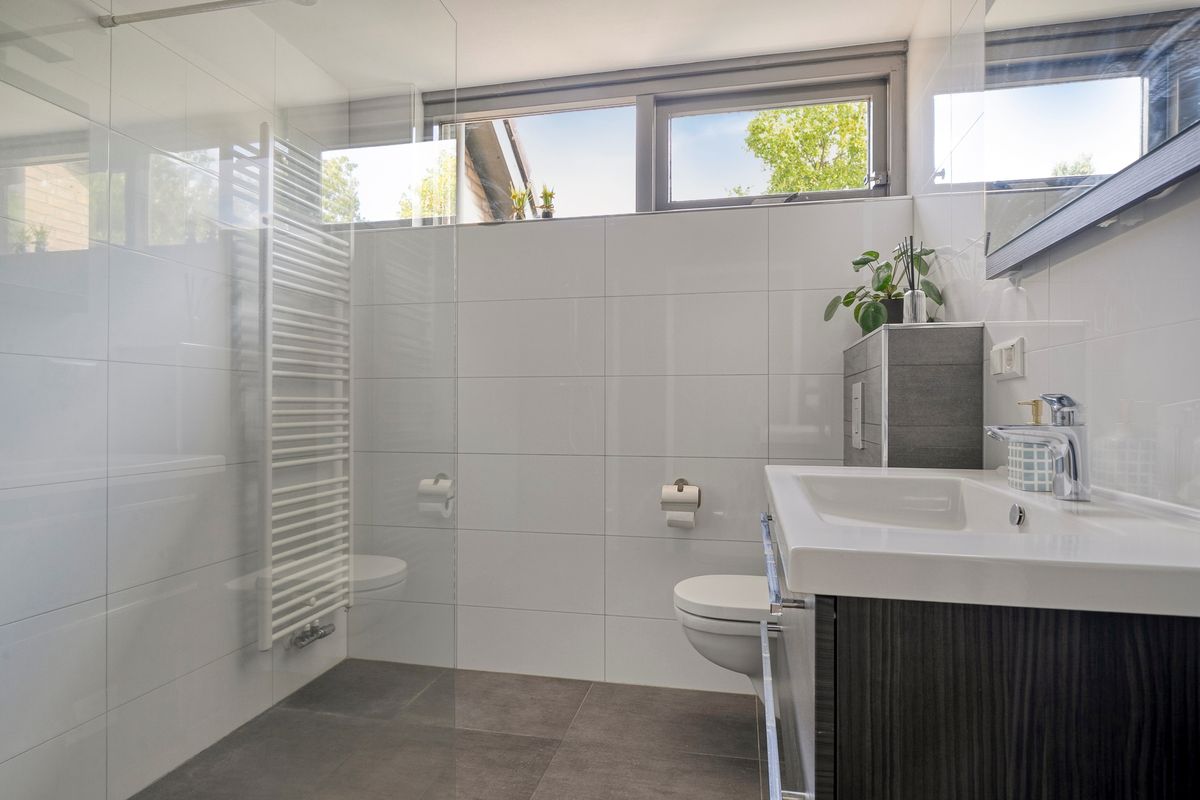 Moderne en opvallende lichte badkamer. Een perfecte ruimte om je even op te frissen voor de dag begint en of voor het slapen gaan. Het raampartij zorgt niet alleen dat er veel daglicht binnen kan stromen, maar ook voor de ventilatie. Wel zo prettig. De badkamer is voorzien van: