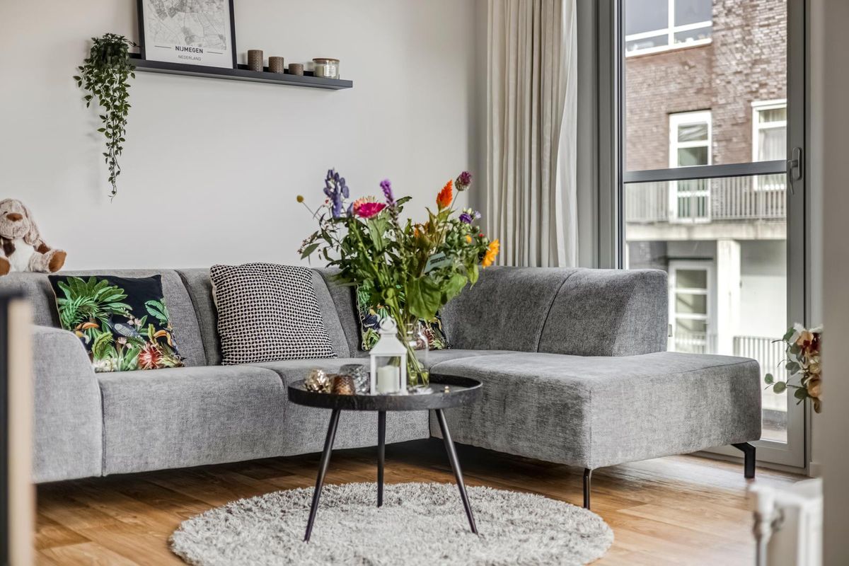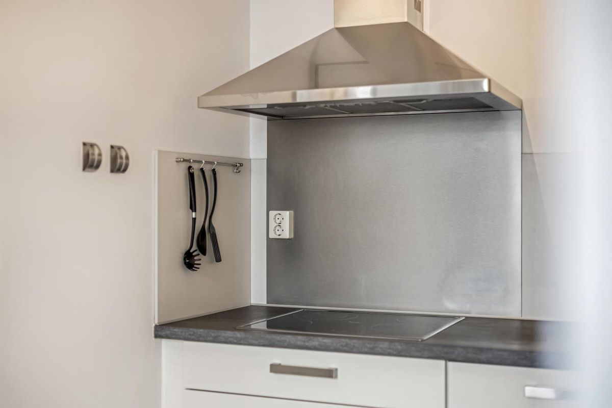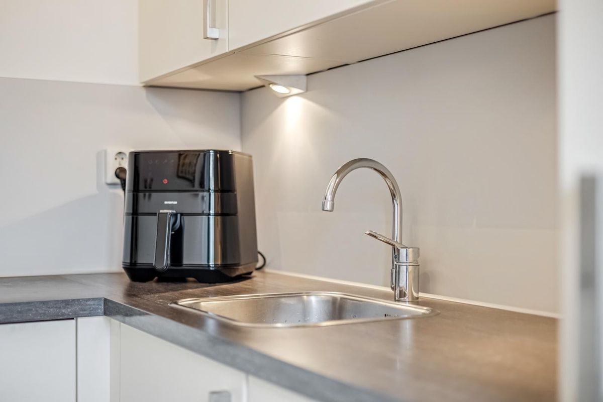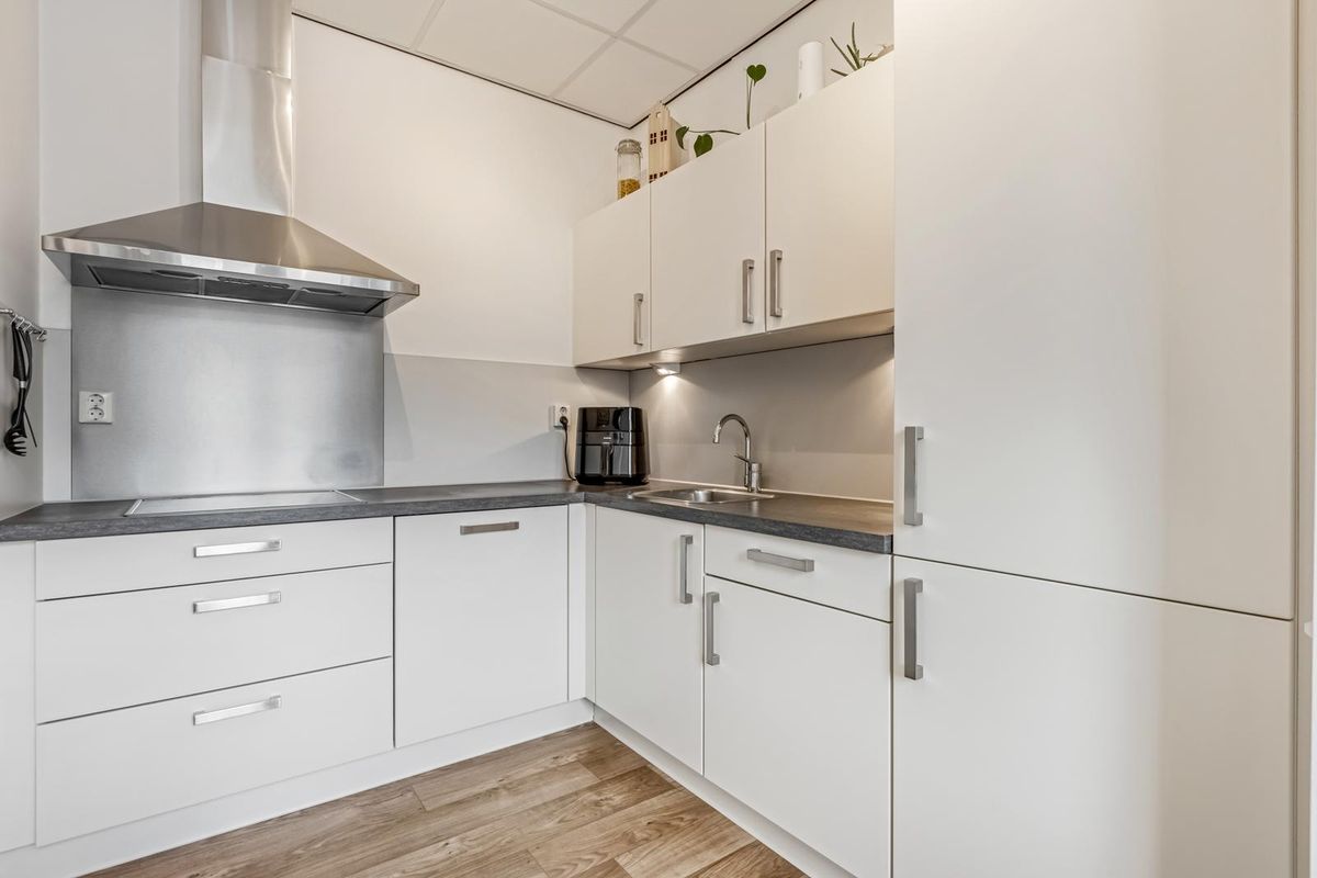 Zodra je binnenstapt, valt de lichte en ruimtelijke sfeer direct op. De woonkamer is verrassend breed en biedt volop ruimte voor een comfortabele zithoek. Dankzij de open verbinding met de keuken voelt alles verbonden aan. De keuken is modern afgewerkt met lichte kasten en een donker werkblad. De hoekopstelling zorgt voor veel werkruimte en een efficiënte indeling, koken was nog nooit zo aangenaam.