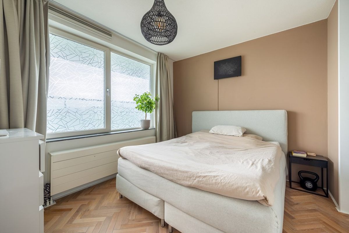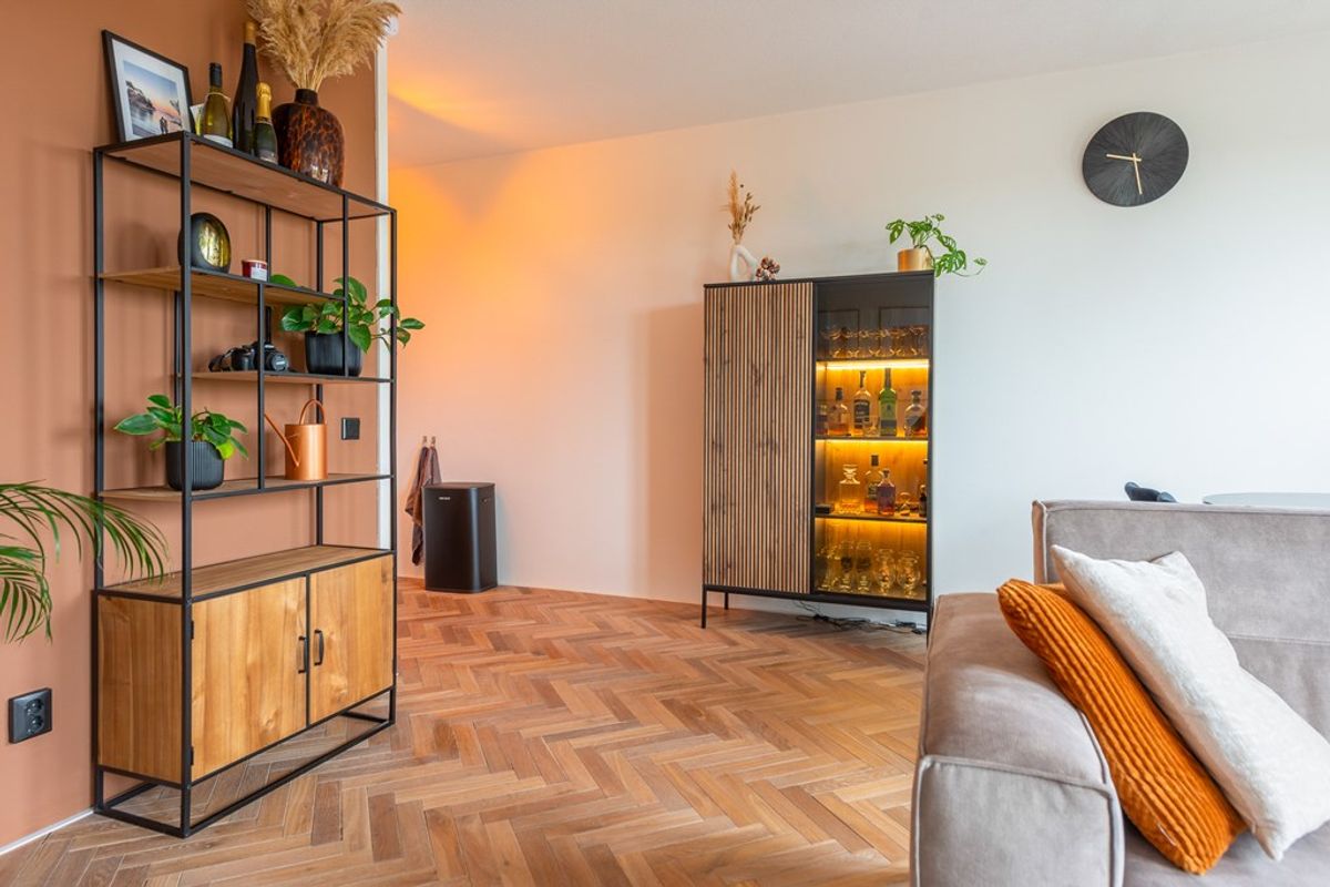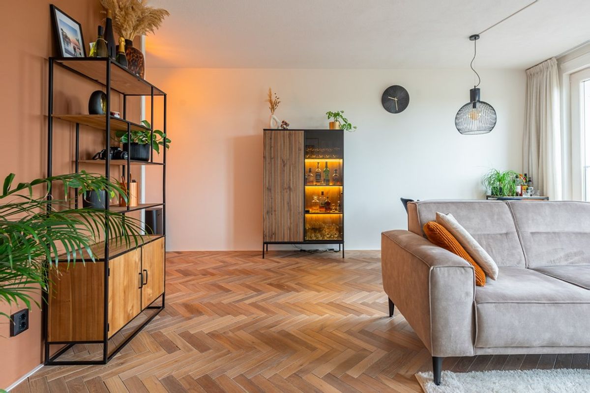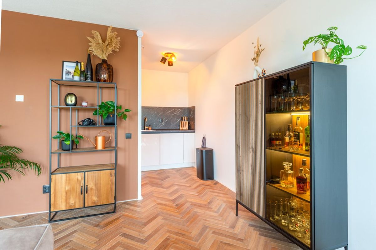 Zodra je de deur van nummer 106 binnenstapt, valt vooral het afwerkingsniveau en de rustige uitstraling op. Het appartement is in 2023 gemoderniseerd waarbij is gekozen voor een warme maar ook strakke stijl. Zo is de gehele woning (behalve de badkamer) voorzien van een fraaie in visgraatmotief gelegde houten lamelparketvloer.