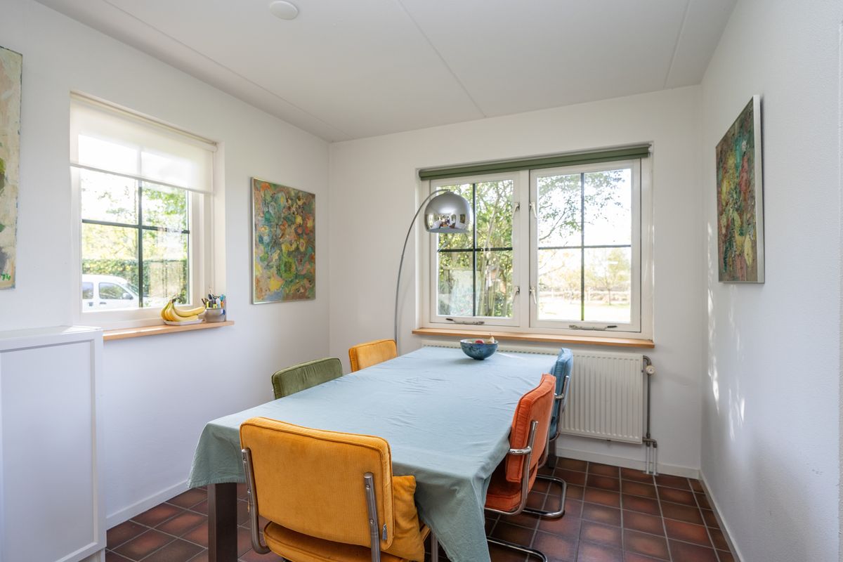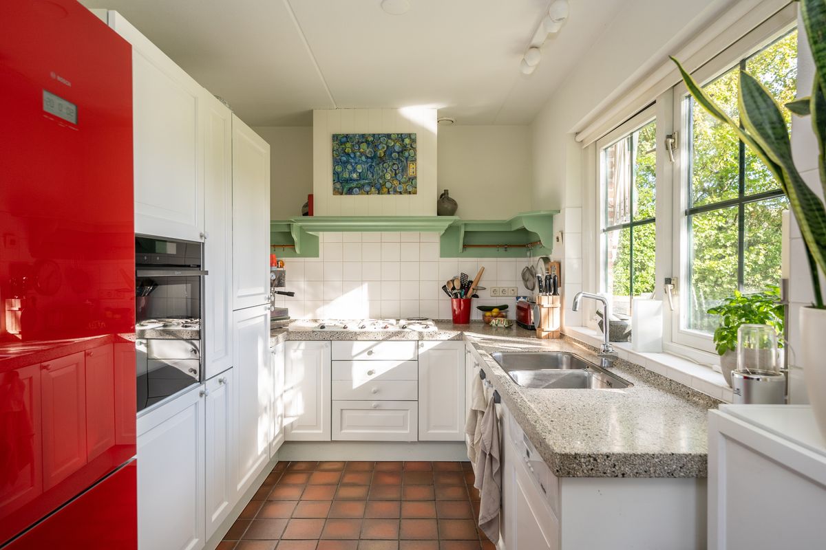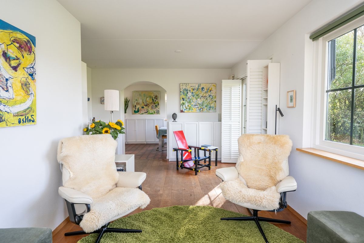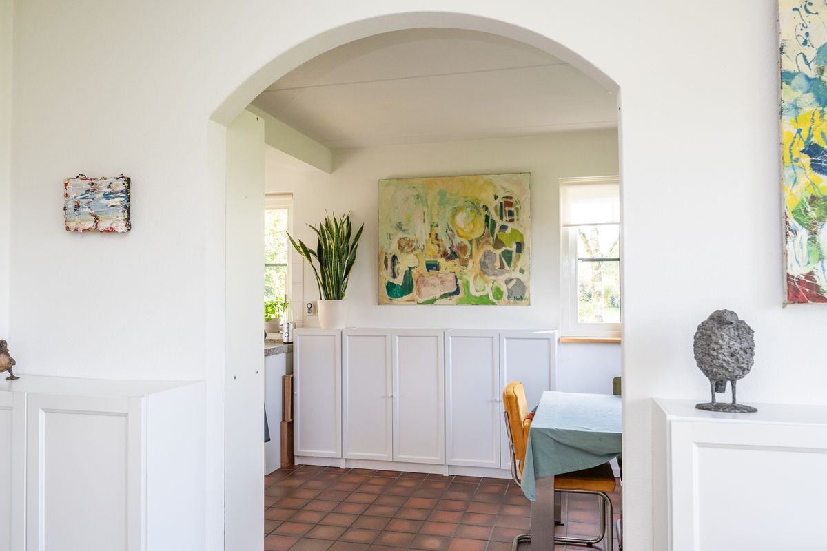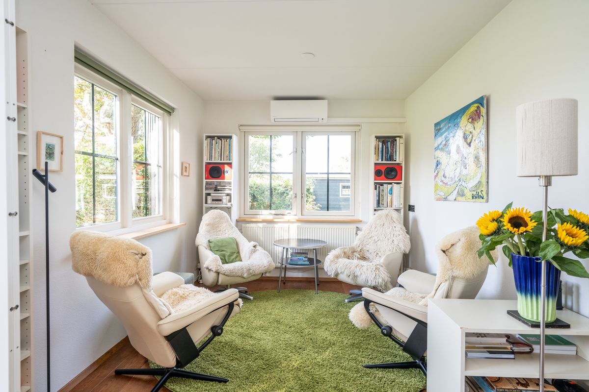 Twee treden lager bevindt zich nog een tweede zithoek (zitkuil) met haard en een lichte erker. Hier valt het daglicht prachtig naar binnen en ontstaat een fijne plek om in alle seizoenen te genieten van het uitzicht op de beschutte achtertuin. Tevens vindt u hier een van de vier airco-units en de aansluiting voor de tv. In de riante hal vindt u het toilet, de meterkast en trapopgang naar de verdieping.