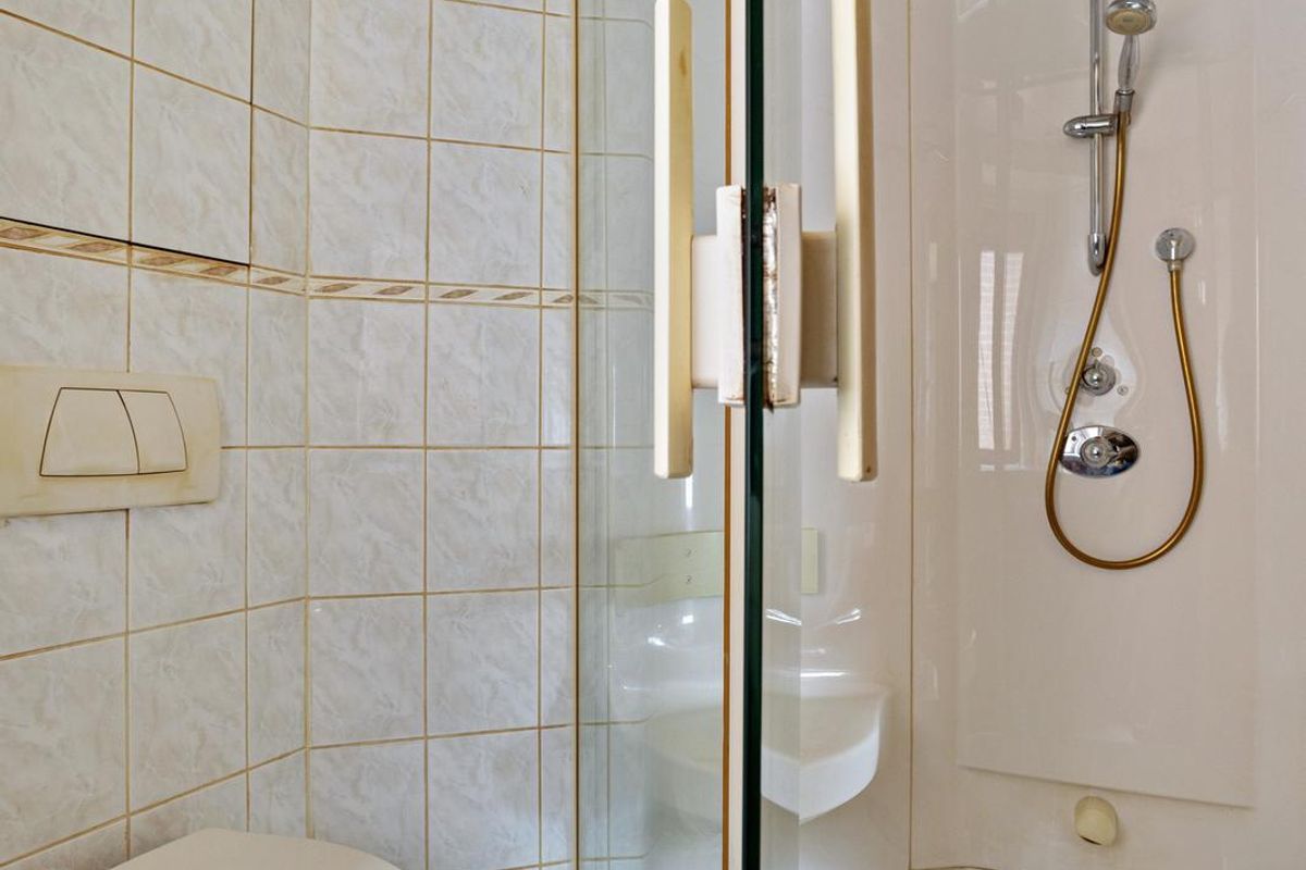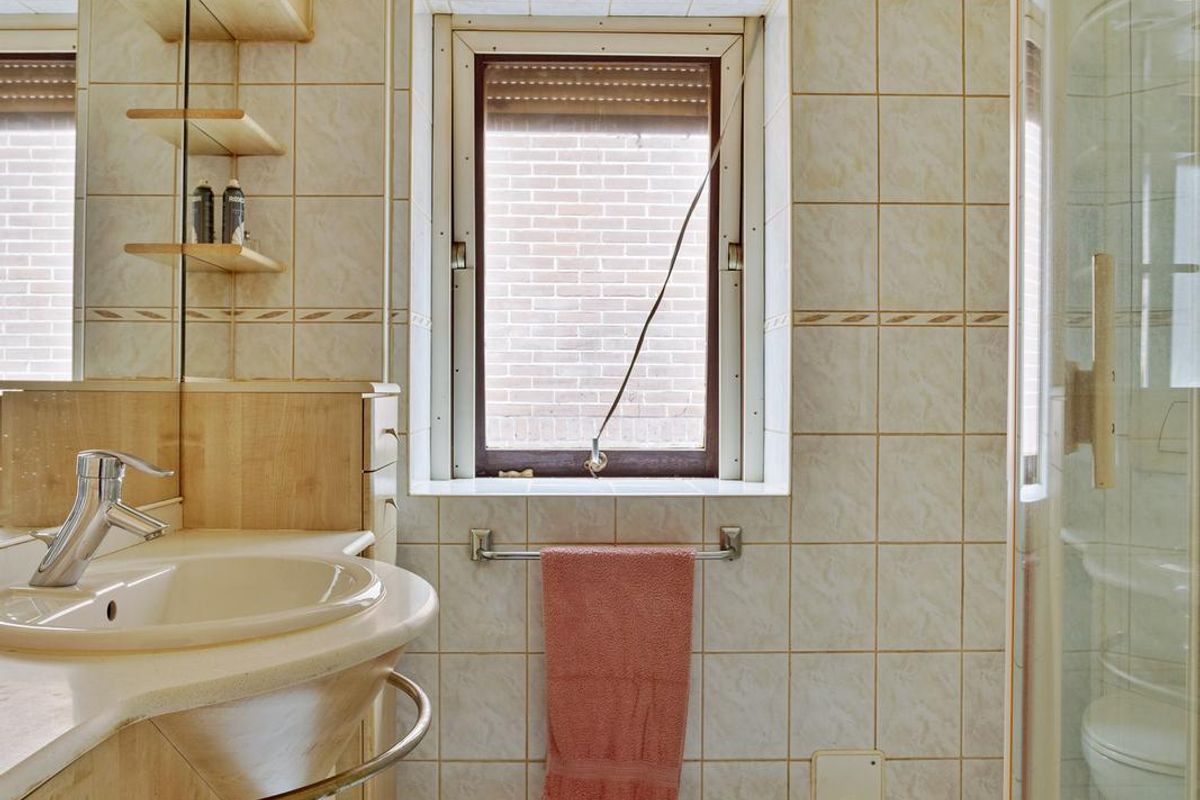 Overloop, 2 slaapkamers en een badkamer voorzien van douche, toilet en wastafelmeubel.