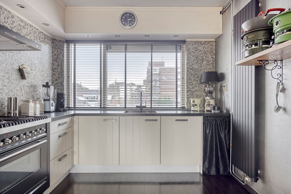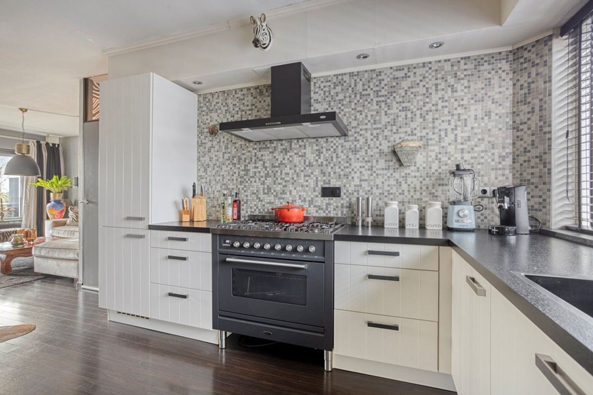 De zeer complete, luxe, open keuken (2019) heeft off-white soft close kasten en laden. Grote hoekopstelling met een breed raam boven het kunststof werkblad. Alle gewenste inbouwapparatuur is aanwezig, te beginnen met de eye-catcher, een Boretti zespits gasfornuis, afzuigkap (A+) met koolstoffilter, koelvriescombinatie (A+), vaatwasser (A++) en een kokendwaterkraan. De koof met inbouwspots en de moderne designradiator maken het geheel mooi af.