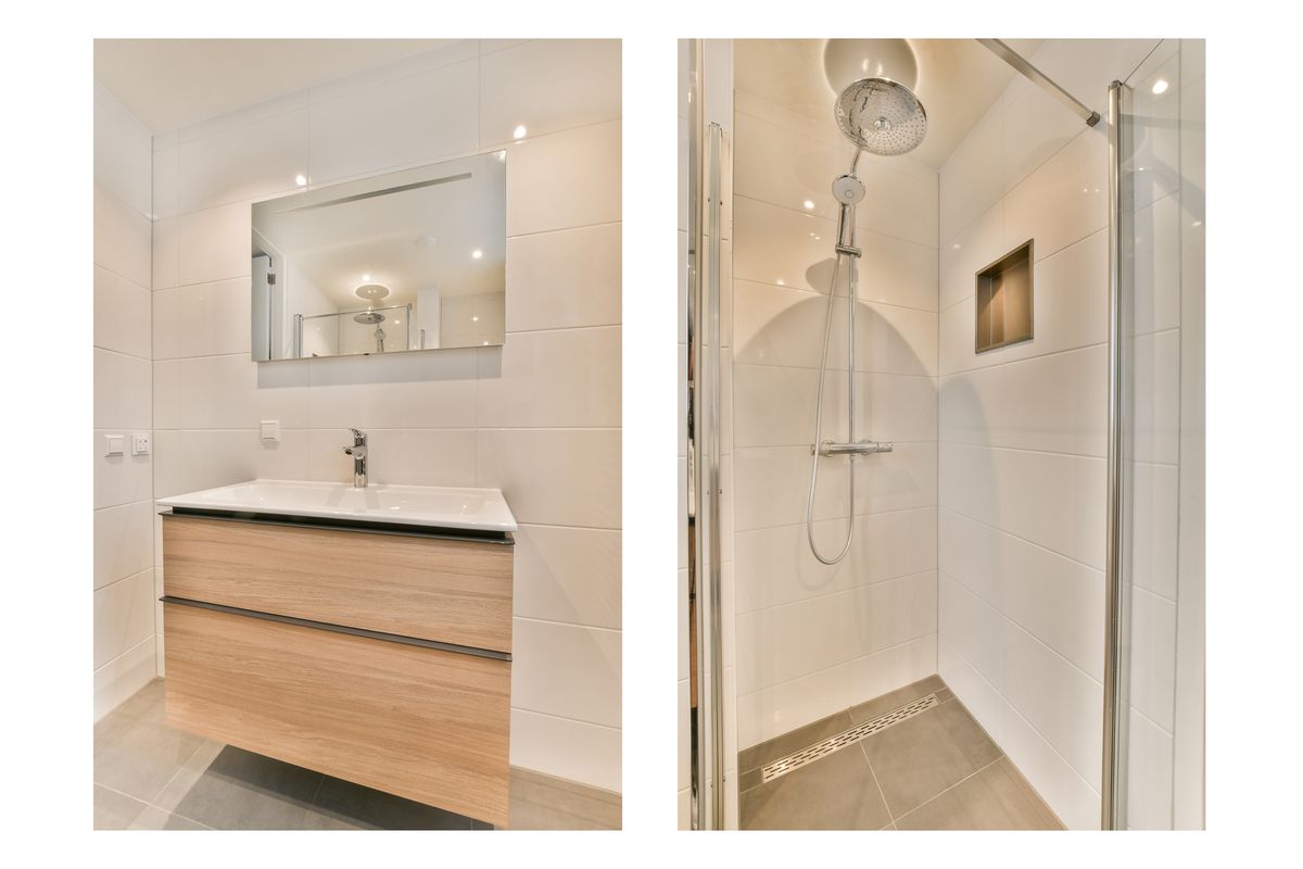 De bovenste etage is bereikbaar via een vaste trap. Hier bevindt zich de master slaapkamer met dakkapel en een tweede badkamer, ingericht met een inloopdouche en een wastafelmeubel.