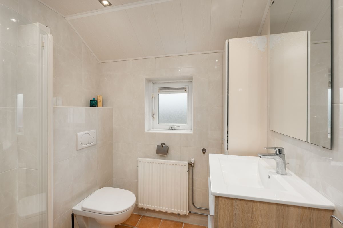 Via de vaste trap bereikt u de overloop, die toegang biedt tot drie slaapkamers en de badkamer. De badkamer is voorzien van een inloopdouche, wandcloset en een stijlvol wastafelmeubel.