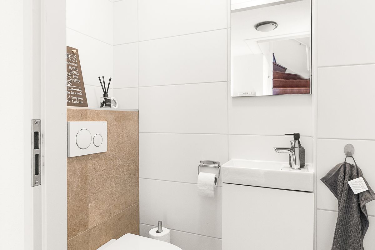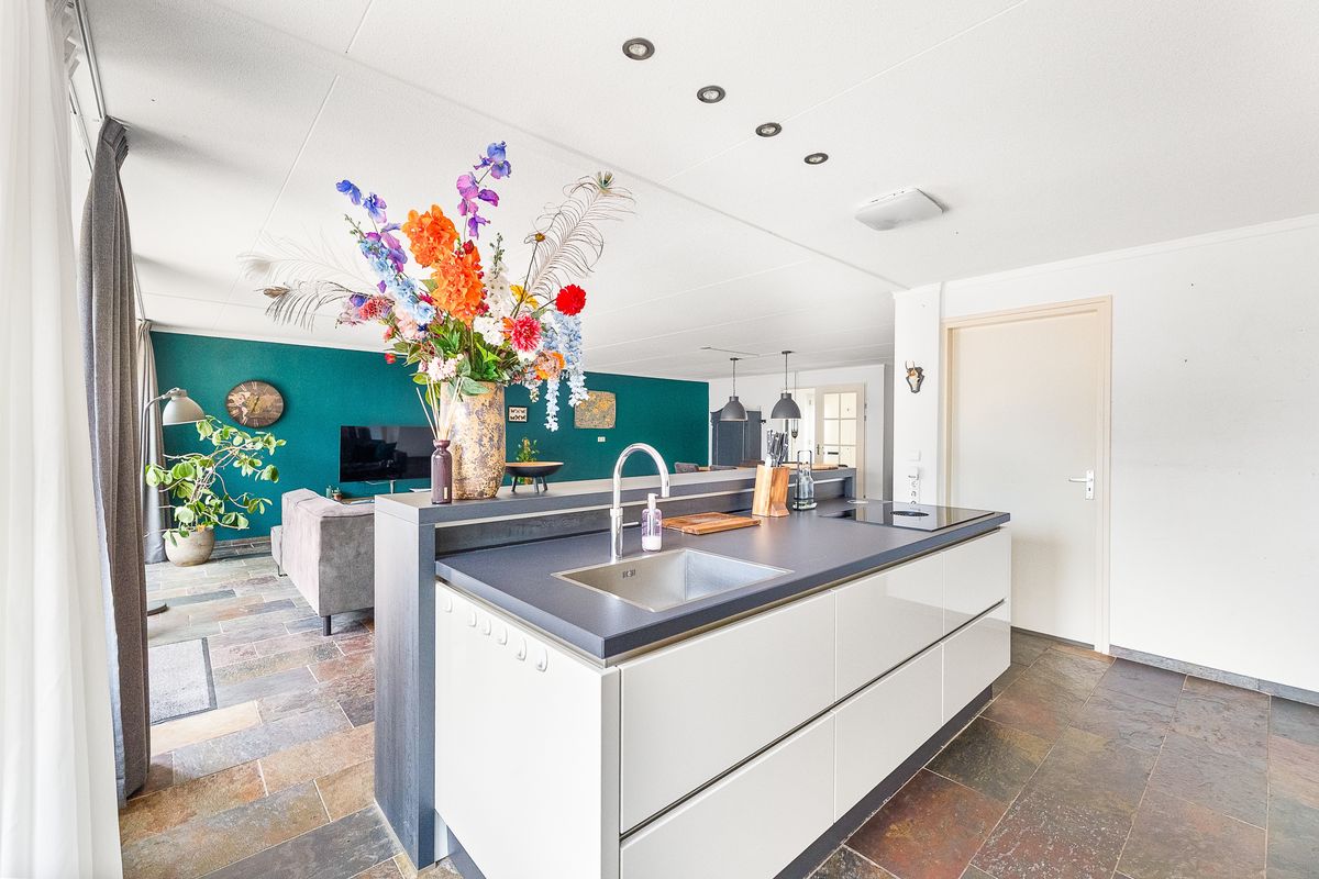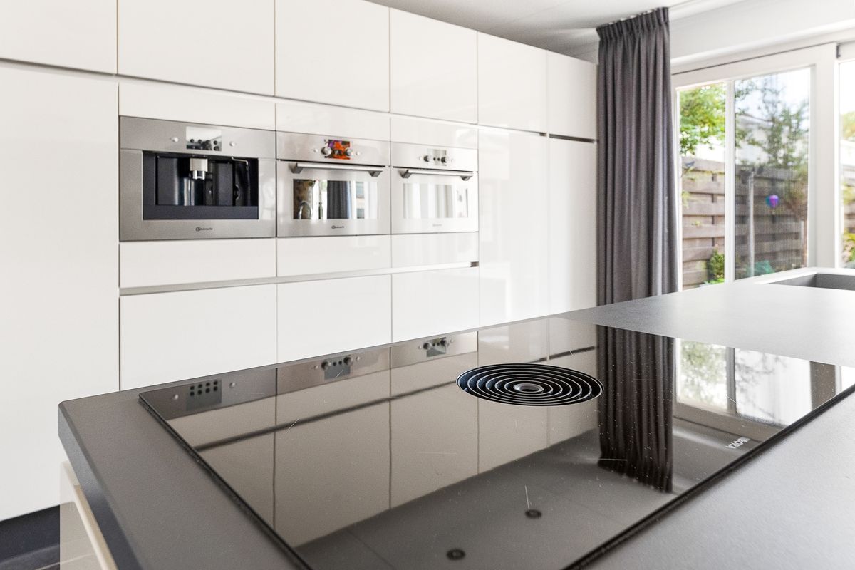 Vanuit de woonkamer treft u de bijkeuken met daar de wasmachine- en droger opstelling. Voorts treft u de via een inpandige doorgang de voormalige garage. Deze is thans verbouwd tot ruime berging met een separate werkkamer.