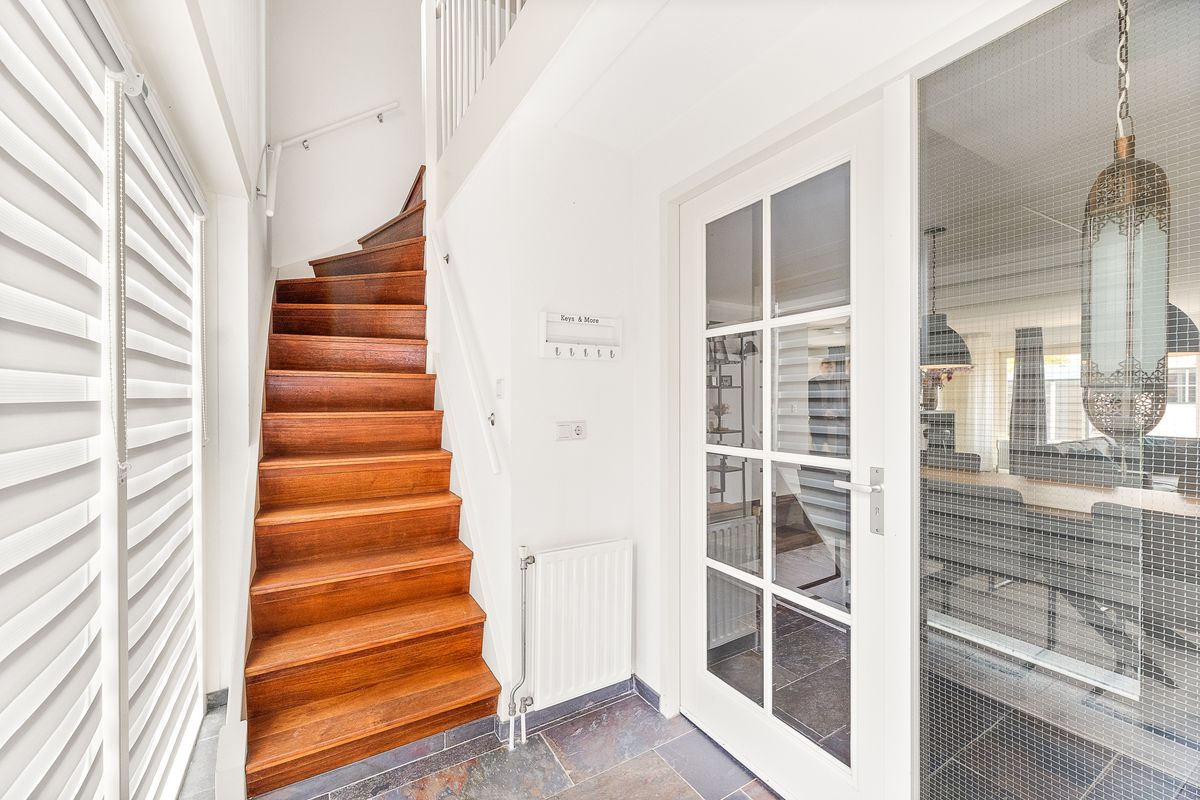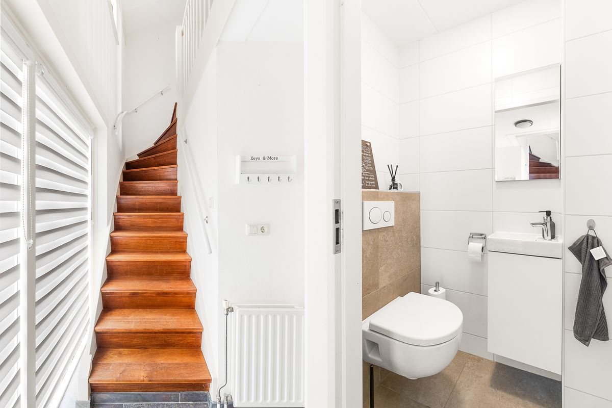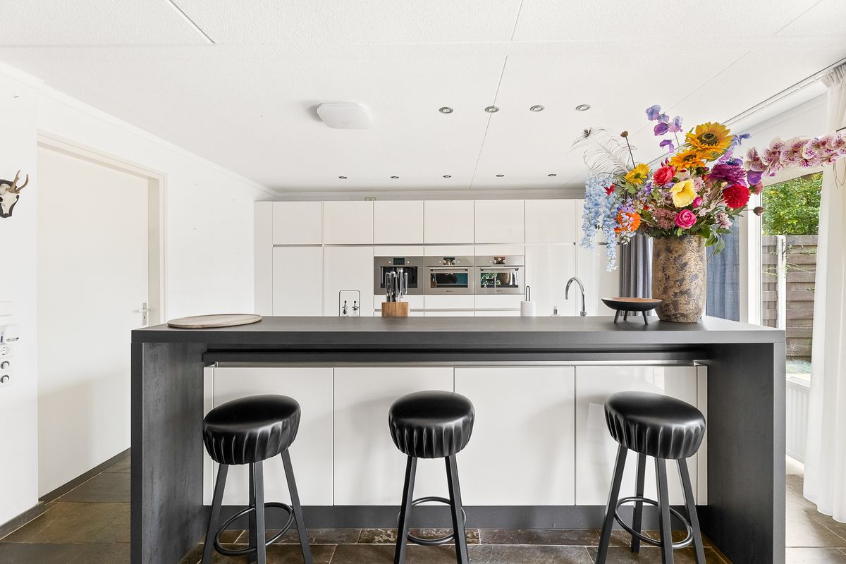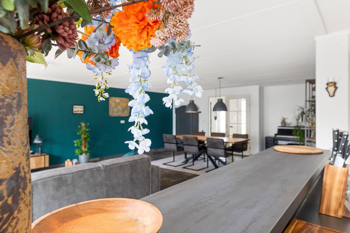 Vanuit de woonkamer treft u de bijkeuken met daar de wasmachine- en droger opstelling. Voorts treft u de via een inpandige doorgang de voormalige garage. Deze is thans verbouwd tot ruime berging met een separate werkkamer.