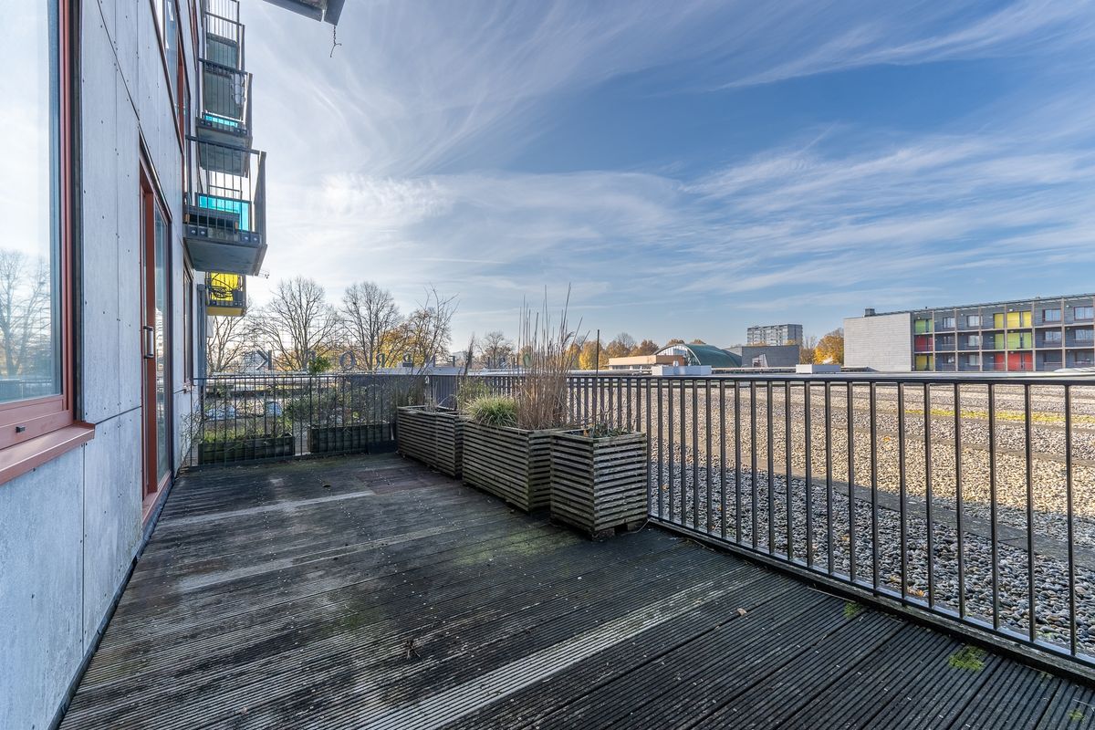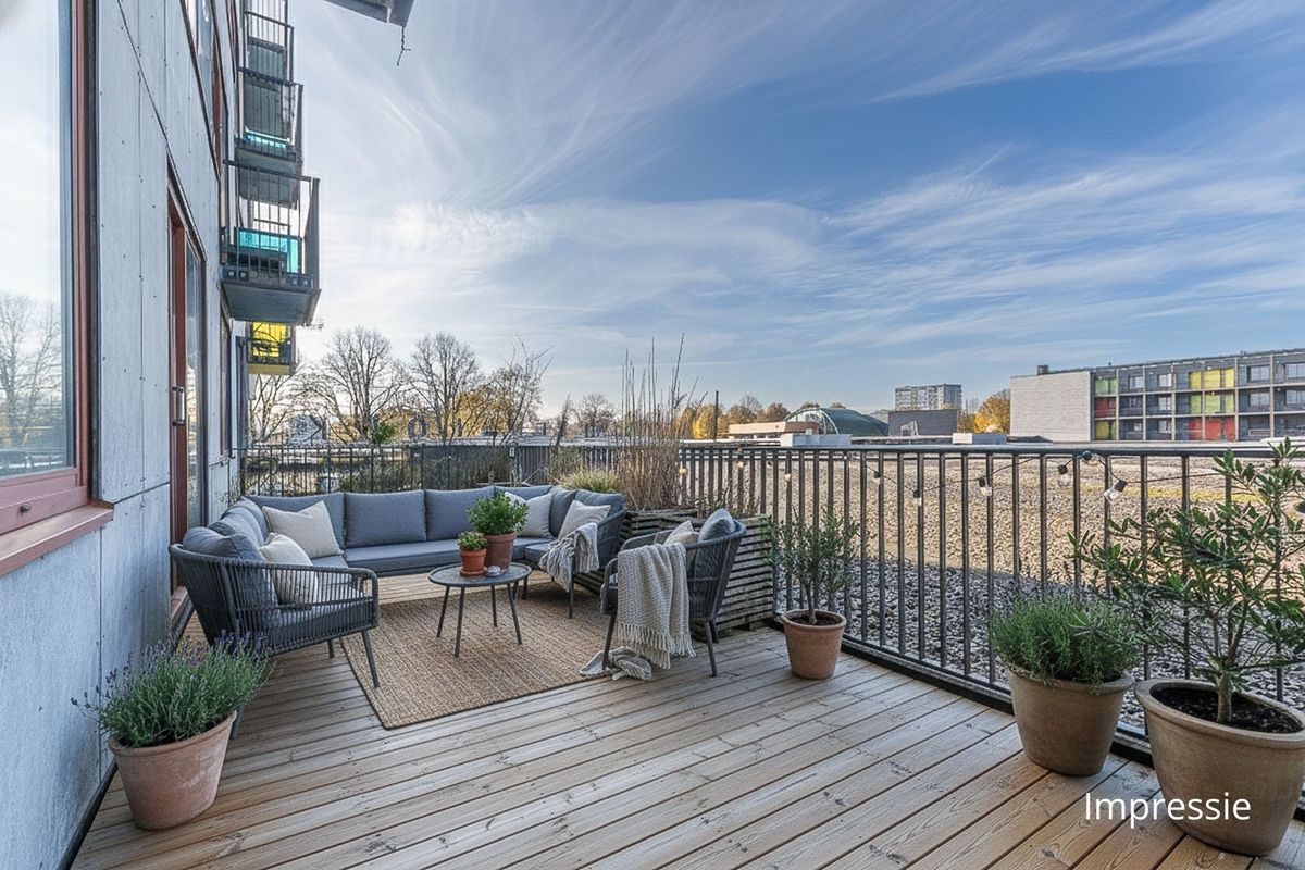 Zodra je de woonkamer instapt, valt het oog direct op de schuifpui naar het brede dakterras. Met een perfecte ligging op het zuidwesten is dit dé plek om te ontspannen in de zon, te borrelen met vrienden of gewoon even tot rust te komen. De buitenruimte strekt zich uit over de volledige breedte van het appartement, waardoor binnen en buiten naadloos in elkaar overlopen.