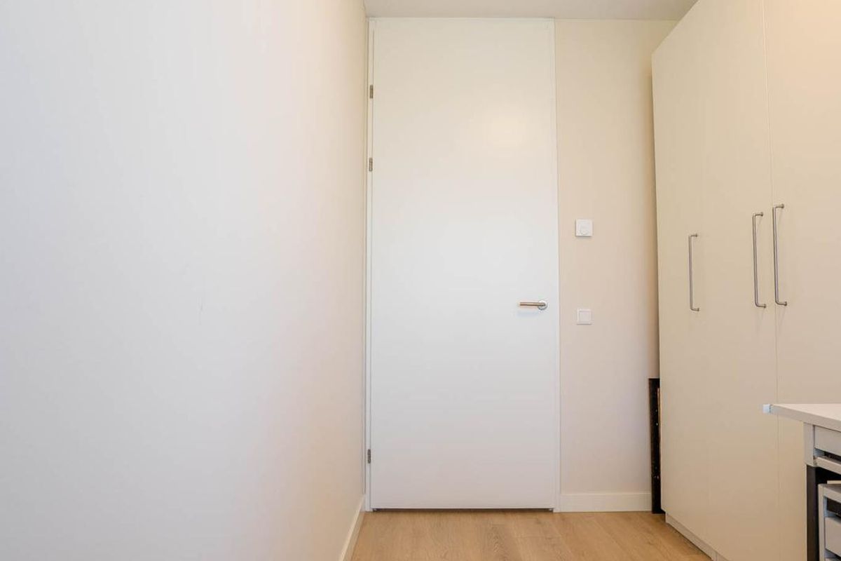 De badkamer is royaal, volledig betegeld en voorzien van vloerverwarming, een inloopdouche, toilet en wastafel met meubel. Daarnaast is er een praktische berging/wasruimte met opstelling voor de wasmachine en technische installaties.