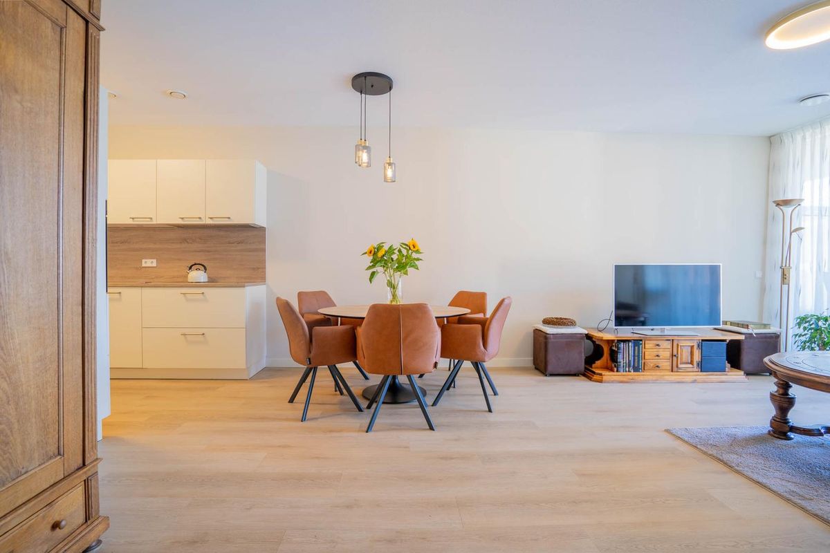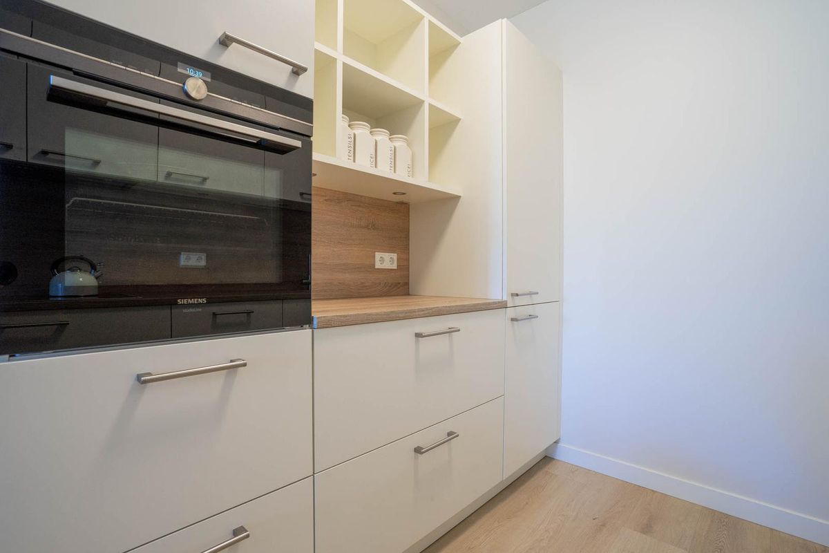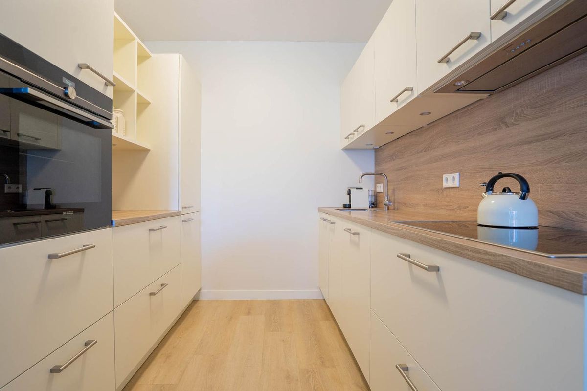 De open keuken is modern uitgevoerd met witte kastjes en houten accenten, en voorzien van alle benodigde apparatuur: koelkast, vaatwasser, inductiekookplaat en combi oven-magnetron. De woonkamer is ruim en licht dankzij de grote raampartijen en tuindeur naar het terras.