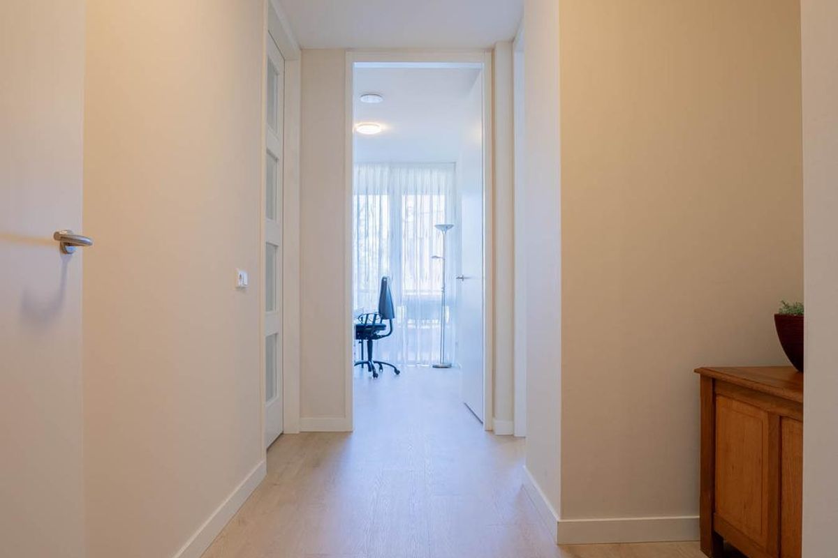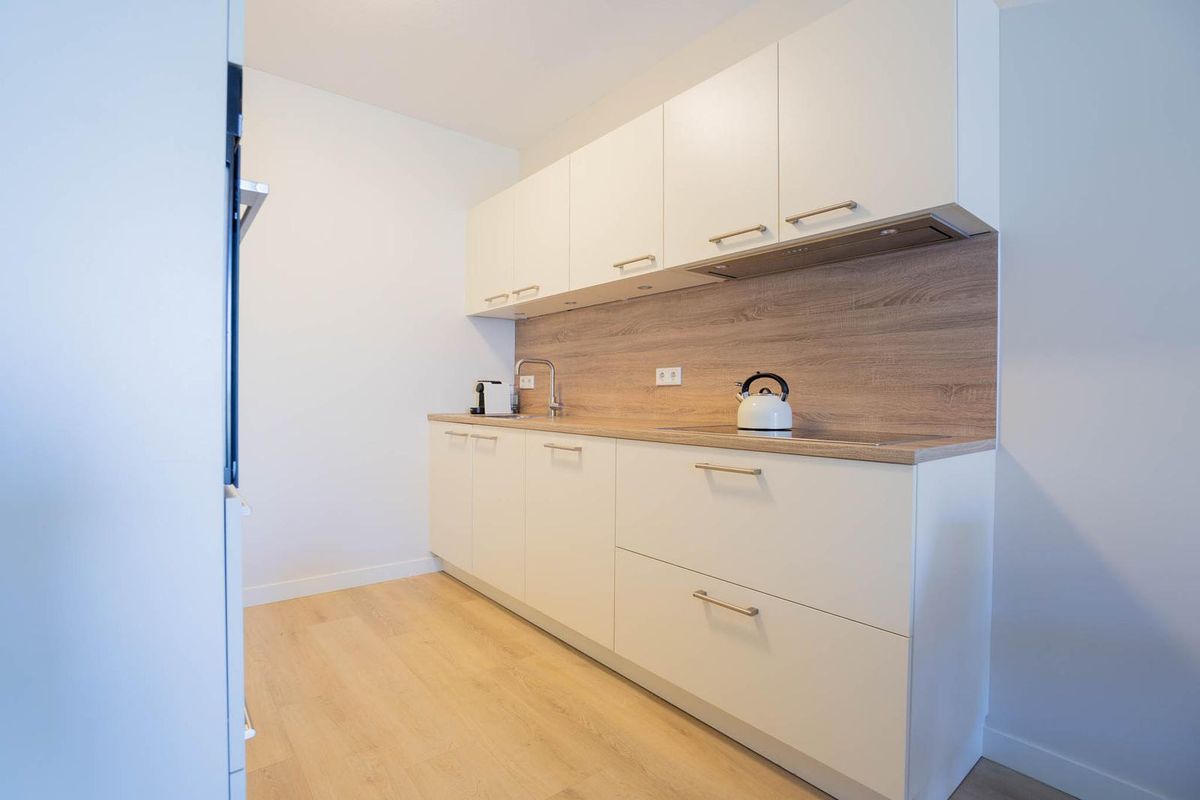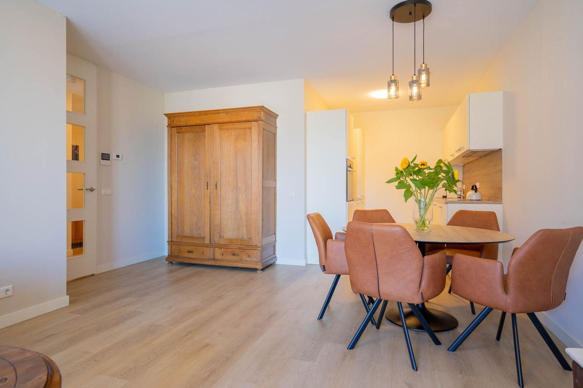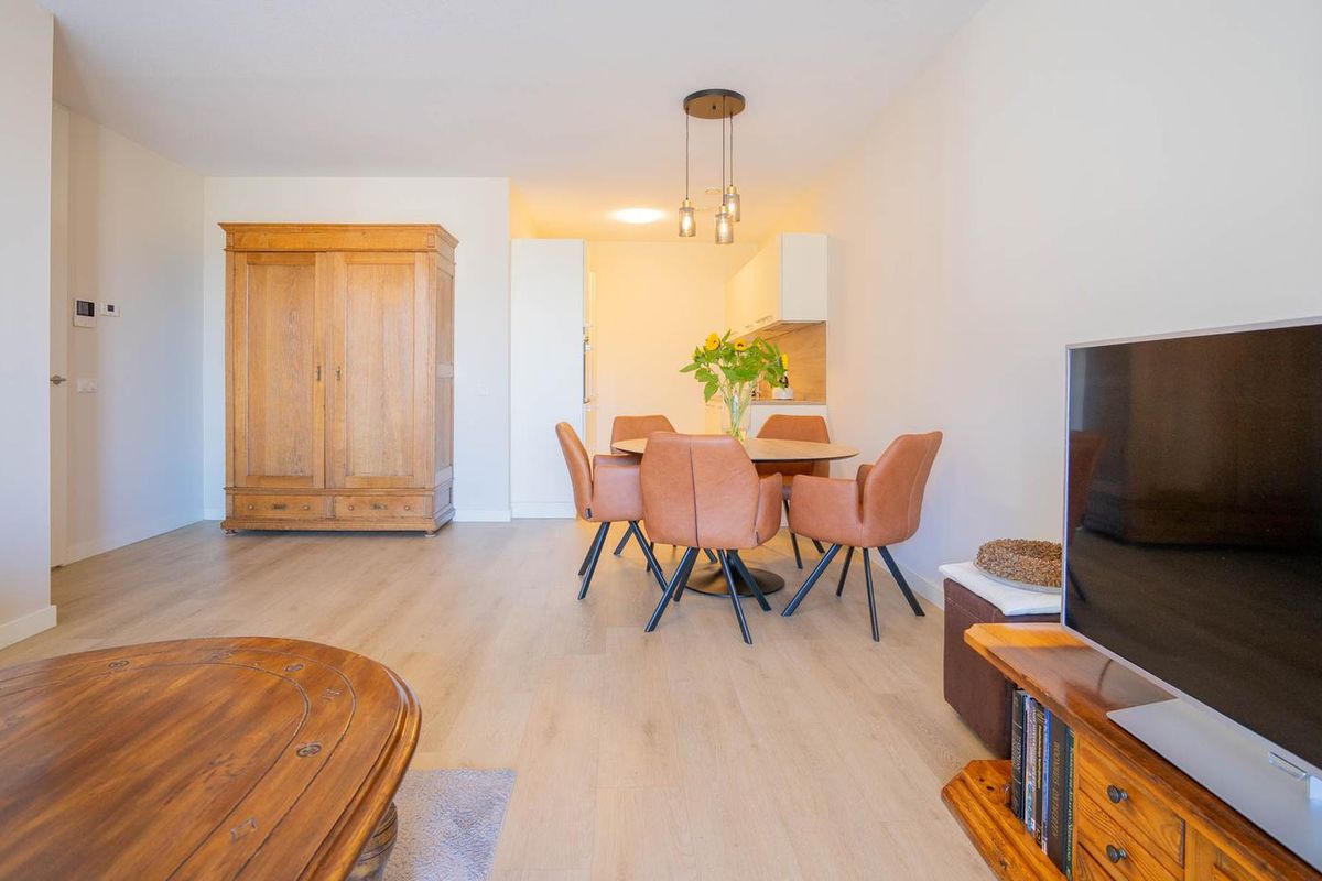 De open keuken is modern uitgevoerd met witte kastjes en houten accenten, en voorzien van alle benodigde apparatuur: koelkast, vaatwasser, inductiekookplaat en combi oven-magnetron. De woonkamer is ruim en licht dankzij de grote raampartijen en tuindeur naar het terras.