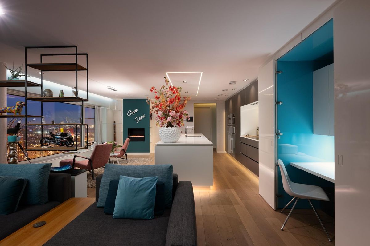 De woonkamer is een ruimte die ademt, leeft en verbindt. Vanuit elke hoek kijk je uit op weer een ander stuk van de stad: de Maas, de Wijnhaven, het Cool District of de Laurenskerk. Het is alsof elk raam zijn eigen schilderij vormt, met licht dat van uur tot uur verandert. De moderne waterdamp-haard brengt een zachte warmte en sfeer in de ruimte, en vormt een mooi contrast met de strakke lijnen van het interieur. De living sluit naadloos aan op het eetgedeelte en de keuken, waardoor er een ruimtelijke, loftachtige beleving ontstaat.
