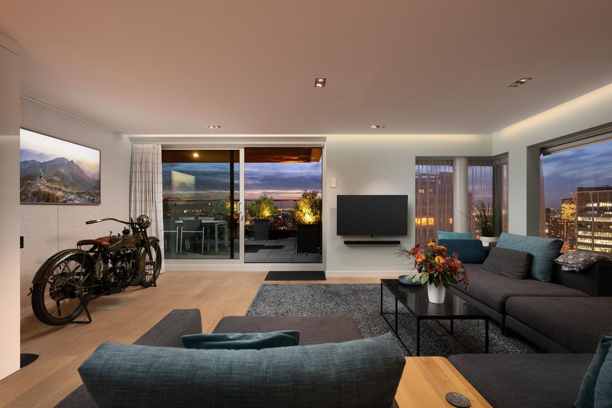 When the sliding doors open, you step onto the XL sun terrace, facing southwest. Measuring 11 x 4.6 metres, it offers an exceptional amount of space. This is where indoors and outdoors blend seamlessly. The view is simply spectacular: the Maas flowing in the distance, the Wijnhaven area unfolding below, the Cool District buzzing further away and the city centre revealing all its diversity.
