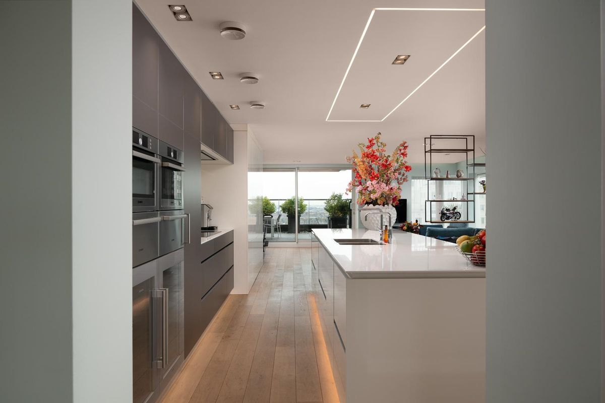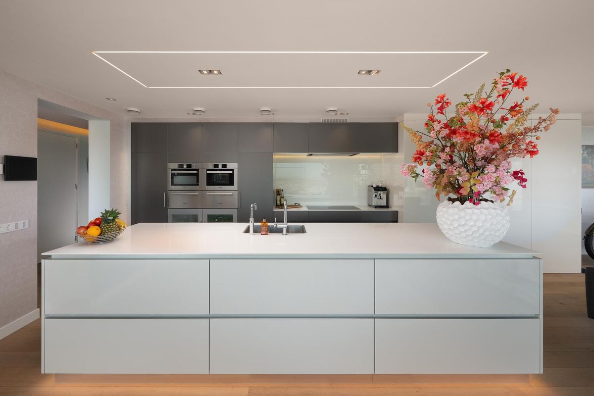 De open keuken uit 2013 combineert stijl met functionaliteit en vormt een belangrijk hart van het appartement. De hoogglans fronten en het ruime kookeiland met geïntegreerde verlichting geven de ruimte een rustige, luxe uitstraling. De keuken is uitgerust met hoogwaardige Bosch-apparatuur, waaronder 2 wijnklimaatkasten, 2 bordenwarmers, een combimagnetron, een stoomoven, een Quooker, een koelkast, een vrieskast en een 5-pits inductiekookplaat.