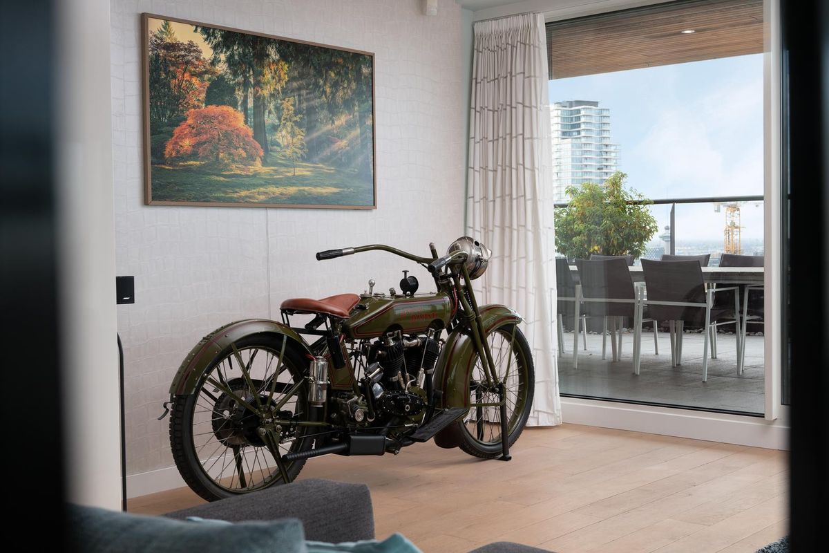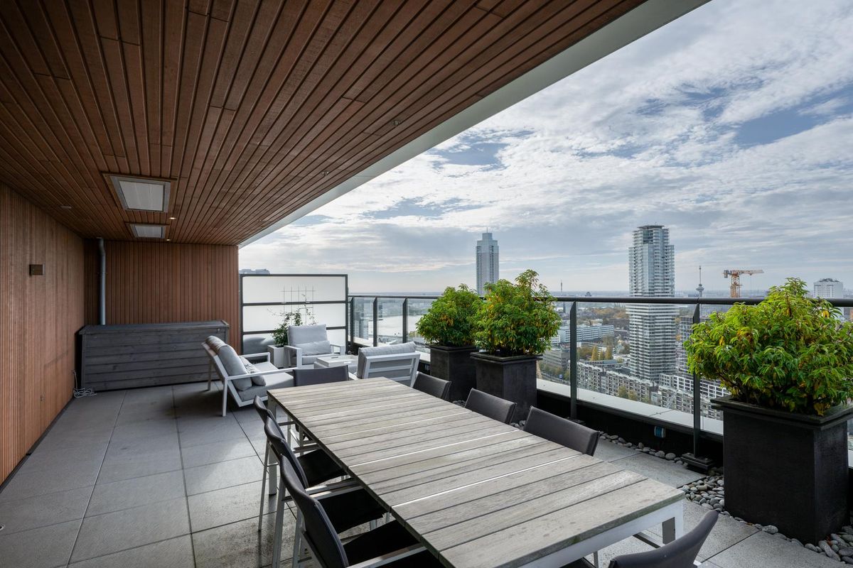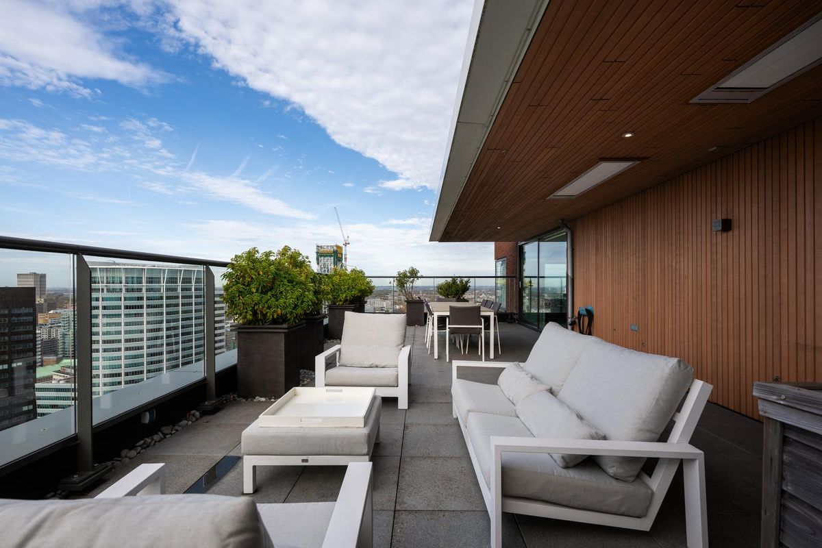 Wanneer de schuifdeuren opengaan, stap je het XL-zonneterras op dat volledig op het zuidwesten ligt. Het terras meet 11 x 4,6 meter en biedt een ongekende hoeveelheid ruimte. Dit is de plek waar binnen en buiten naadloos in elkaar overlopen. Het uitzicht is ronduit spectaculair: de Maas stroomt verderop, het Wijnhavengebied strekt zich uit, het Cool District bruist in de verte en de binnenstad toont zich in al haar diversiteit.