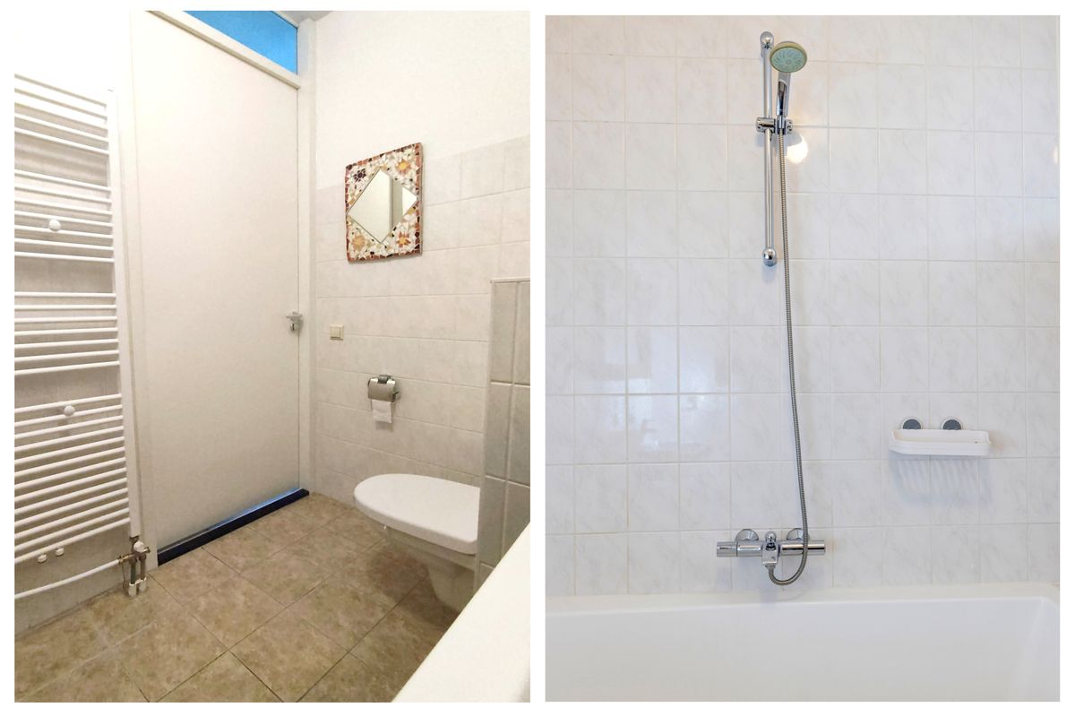 De badkamer is eveneens vanuit de hal te bereiken. Deze is ruim en bevat een wandcloset toilet, een fraai dubbel wastafelmeubel, designradiator en een ligbad.