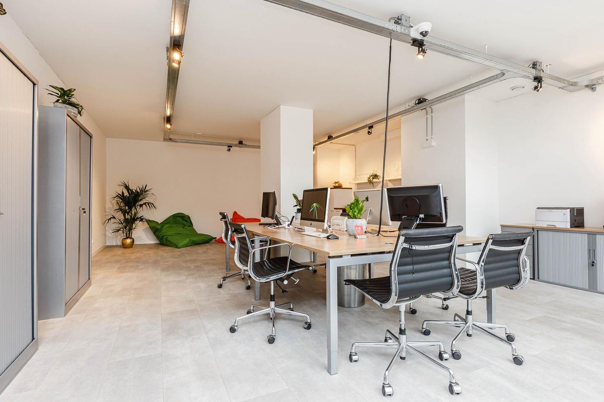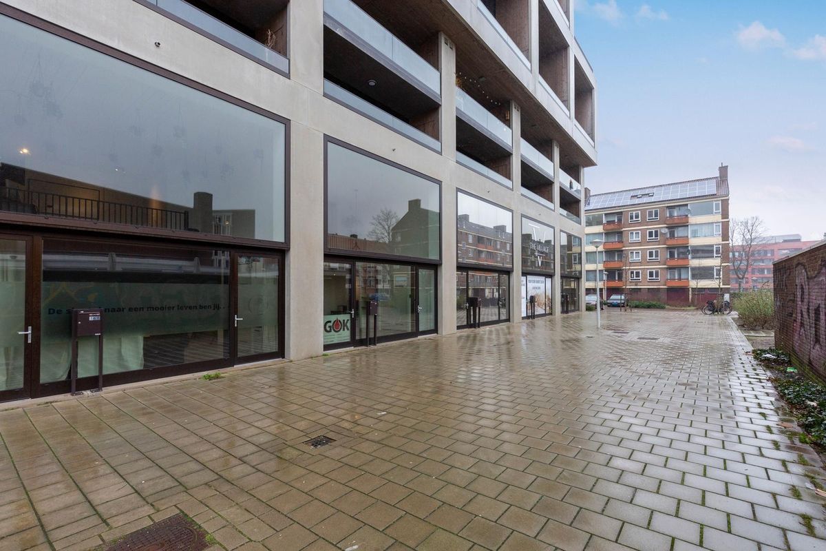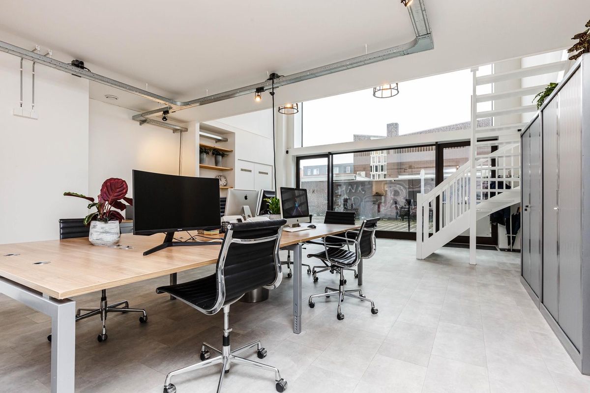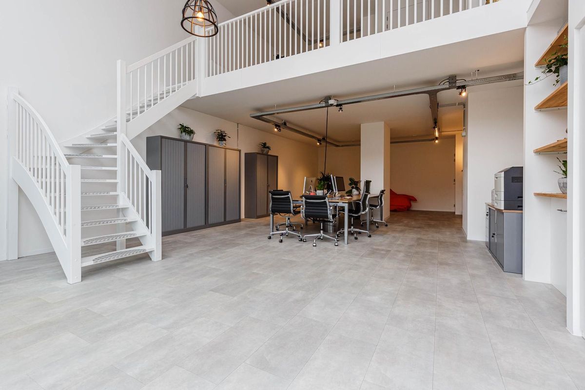 Bij binnenkomst valt direct de fantastische plafondhoogte op en krijgt de ruimte door de glazen voorzijde een zee van licht. Op de begane grond van ongeveer 78 m2 bevindt zich in de huidige situatie het kantoor met achterin de keuken. Via de trap bereikt u de mezzanine met o.a. een overlegruimte en twee separate toiletten.