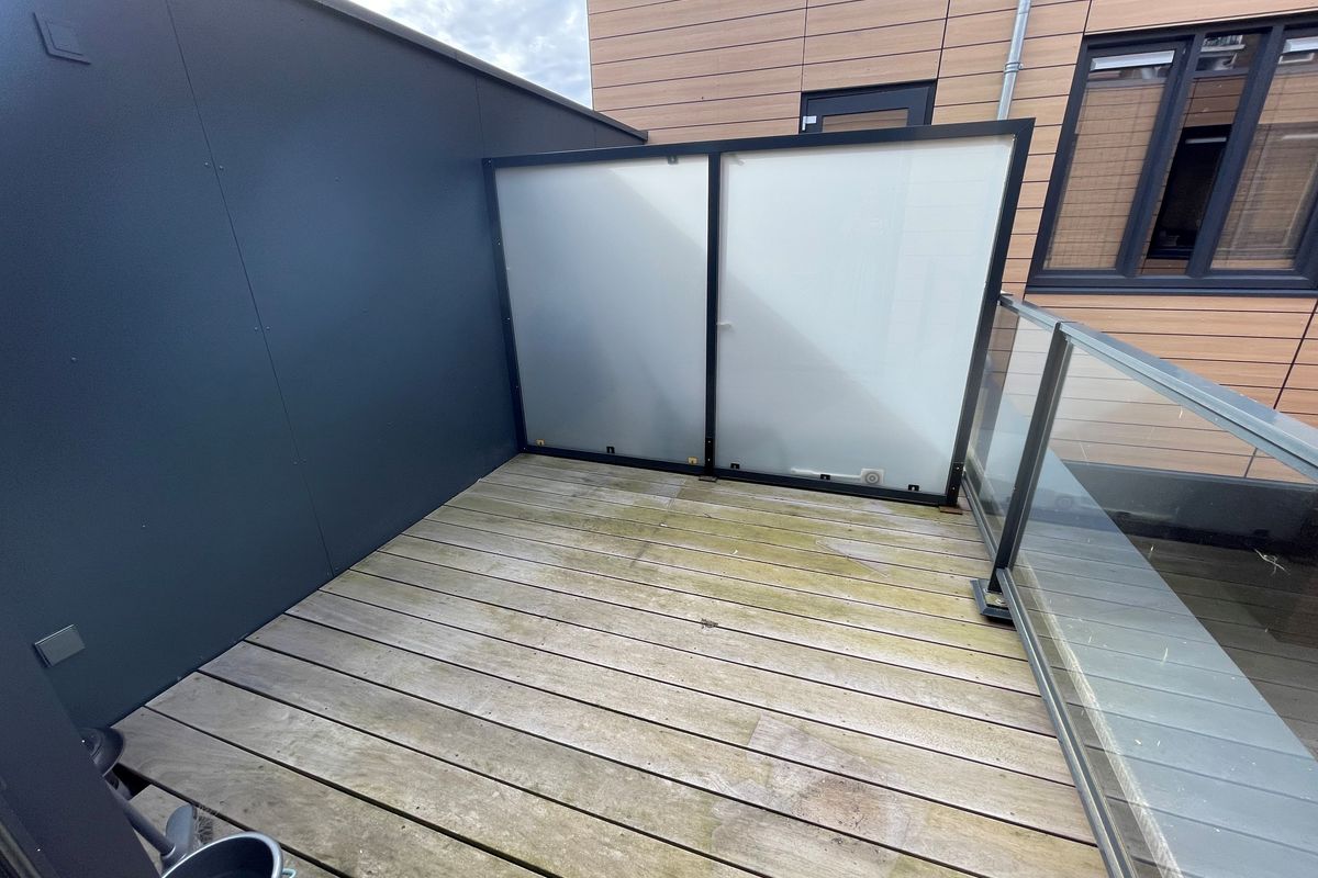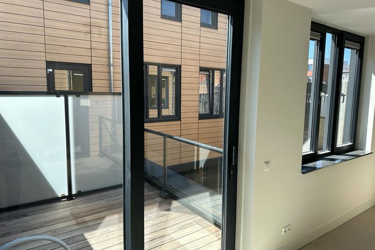 Vanuit de woonkamer grote schuifdeuren naar het balkon voorzien van een houten vlondervloer.