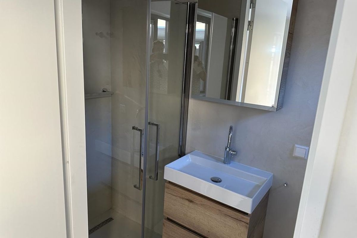 De wanden zijn voorzien van beton-cire wat een luxe ‘look and feel’ geeft, samen met hoogwaardig sanitair van het merk Grohe is dit een badkamer van goede kwaliteit te noemen.
