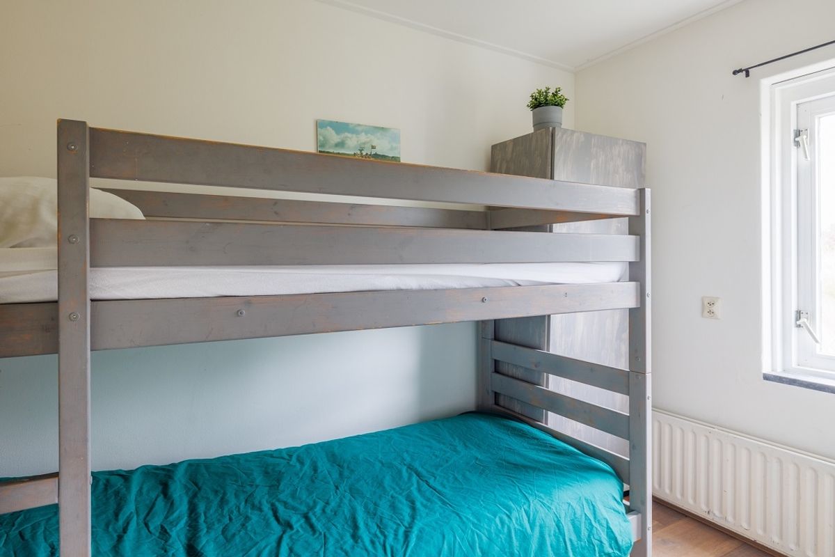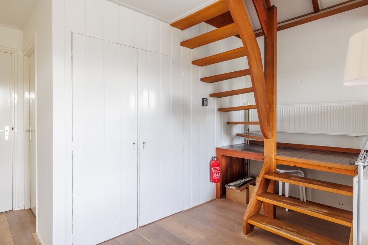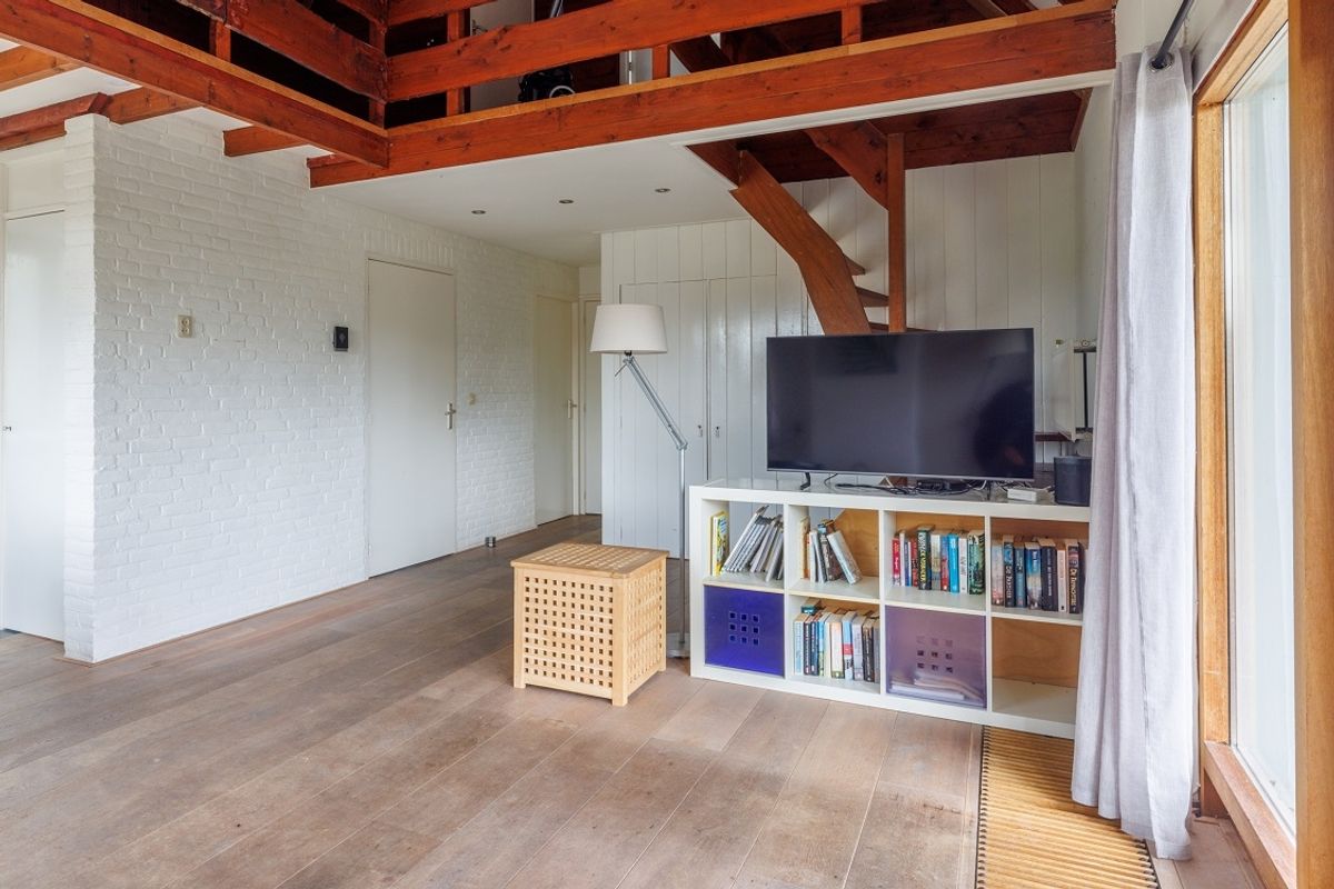De leefruimte heeft houten vloeren, een hoog plafond met houten balken en een vide waar een heerlijk privé hoekje te creëren is.