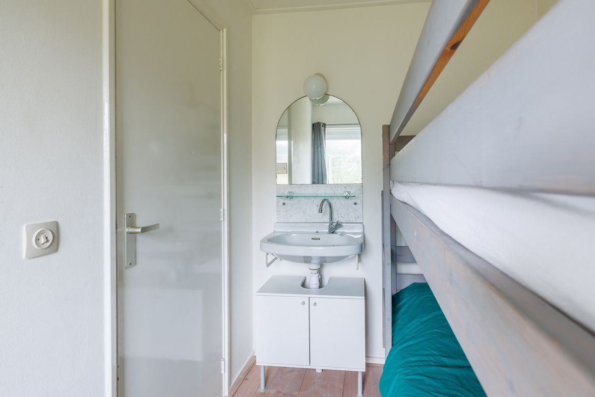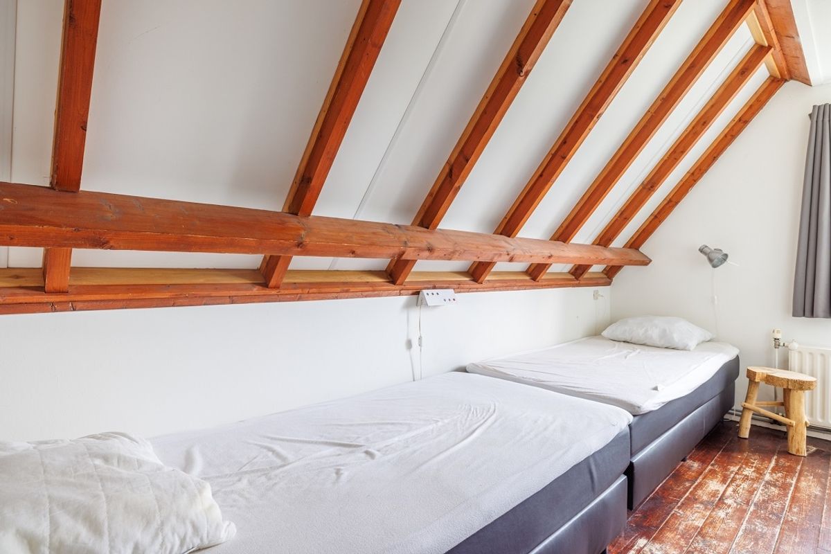 Slaapkamer met twee boxspringbedden, wastafel en vaste kast.