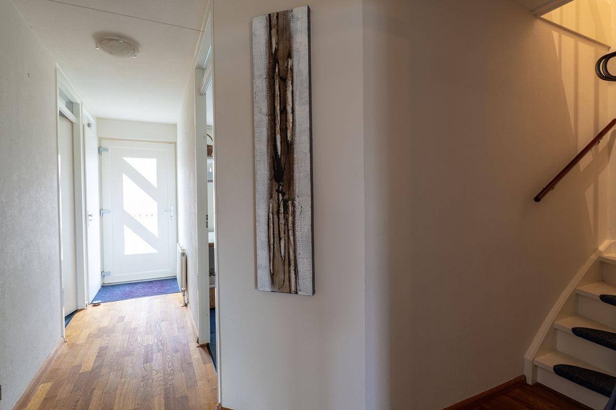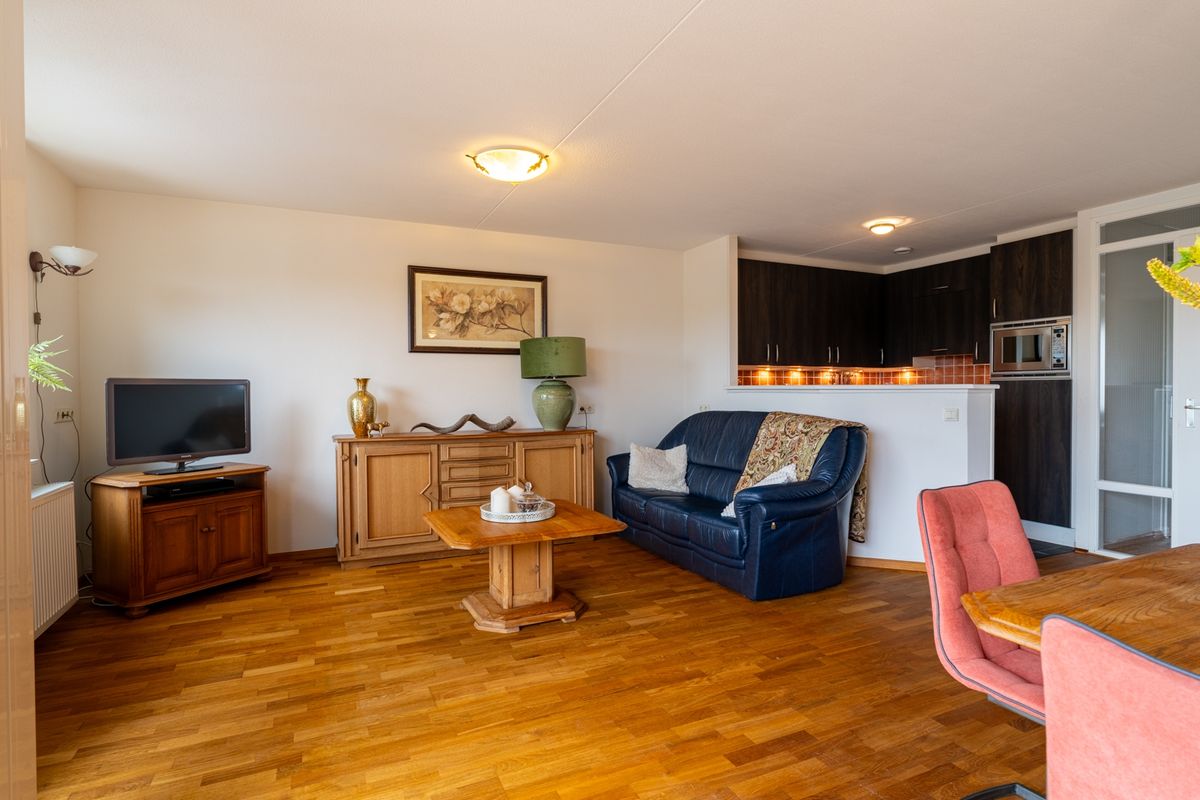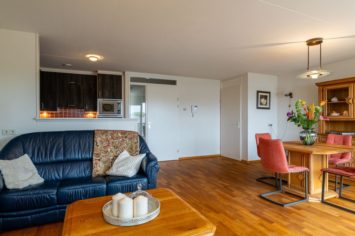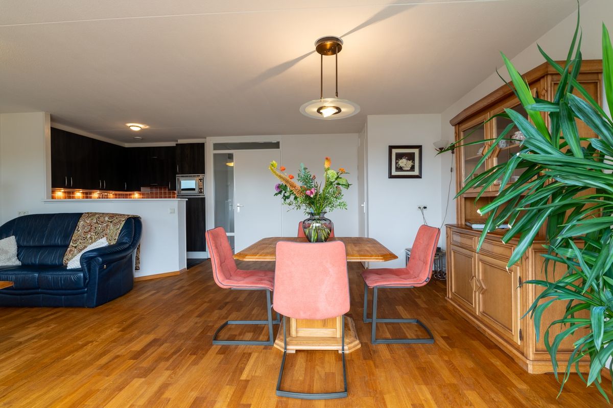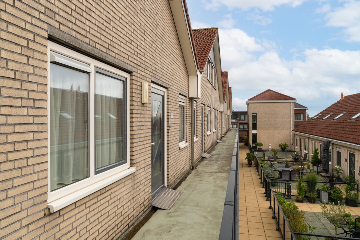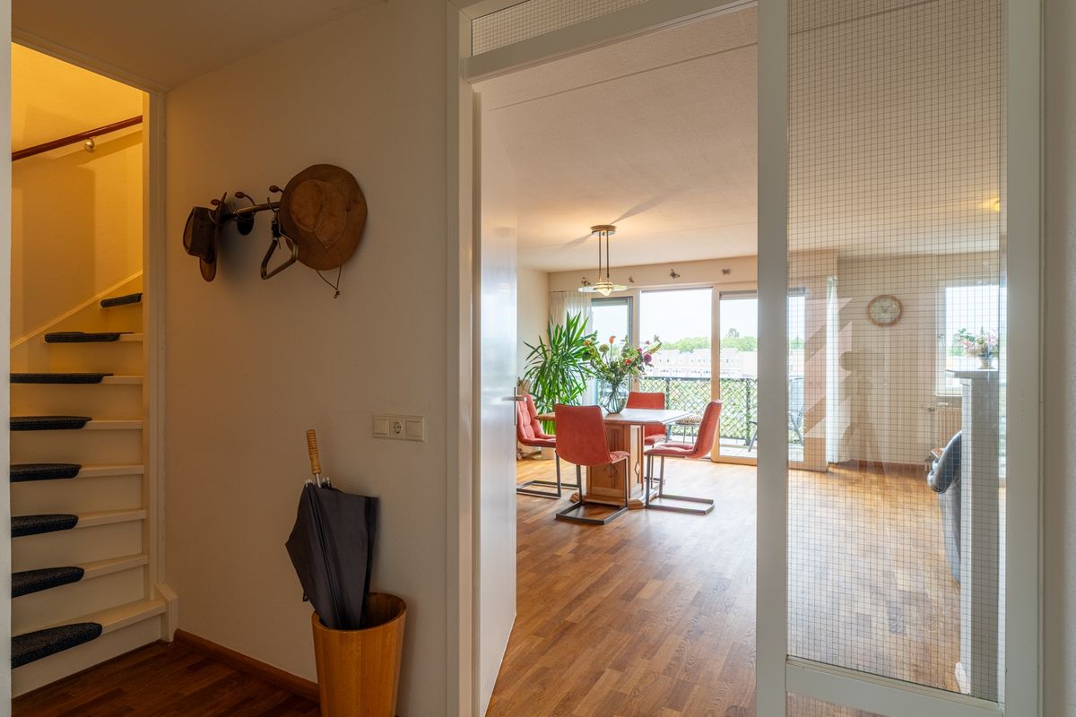 Via de galerij kom je in de hal, die toegang biedt tot praktisch alles: een slaapkamer, het toilet, de wasruimte en natuurlijk de lichte woonkeuken. Die keuken en woonkamer lopen heerlijk open in elkaar over – het resultaat is een fijne leefruimte waar je echt alle kanten mee op kunt. Dankzij de grote raampartijen baadt de woning in het licht en door de schuifpui stap je zo het balkon op. Het voelt hier alsof je buiten naar binnen haalt. De vaste trap maakt het verhaal compleet: een appartement met een tweede woonlaag voelt nét wat specialer en geeft extra vrijheid. Hier woon je in een appartement, maar heb je het comfort en gevoel van een huis.
