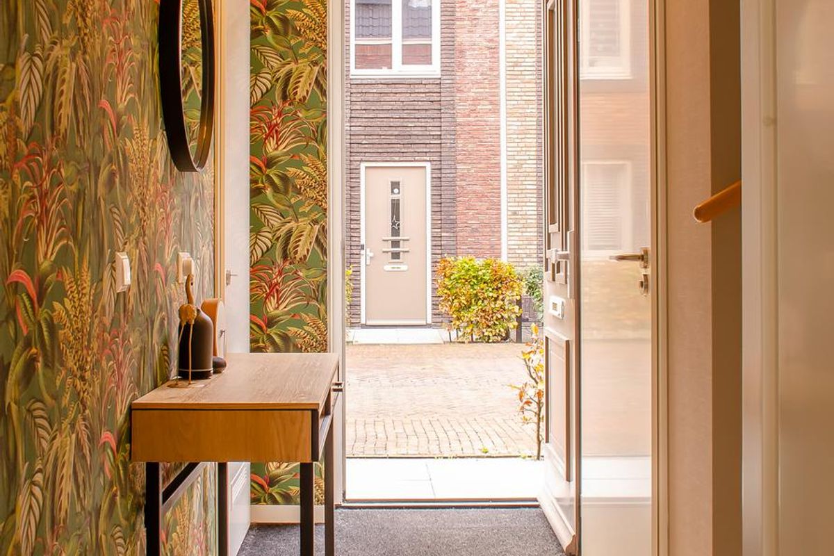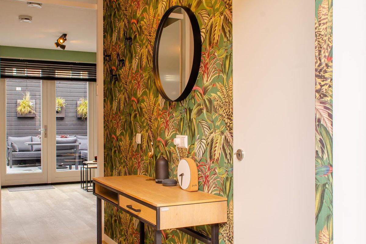 Via de voortuin betreedt u de ruime hal waarvan één muur voorzien is van een mooi design behang, het geheel heeft een luxe uitstaling. Direct links achter de deur vindt u de warmtepomp. Daarnaast is er plaats voor de garderobe en bevindt zich hier het toilet met apart fonteintje en de meterkast.