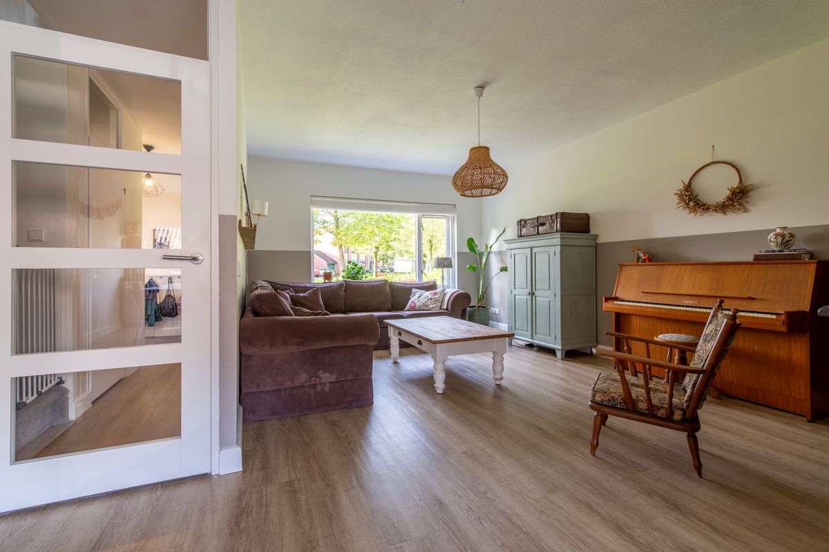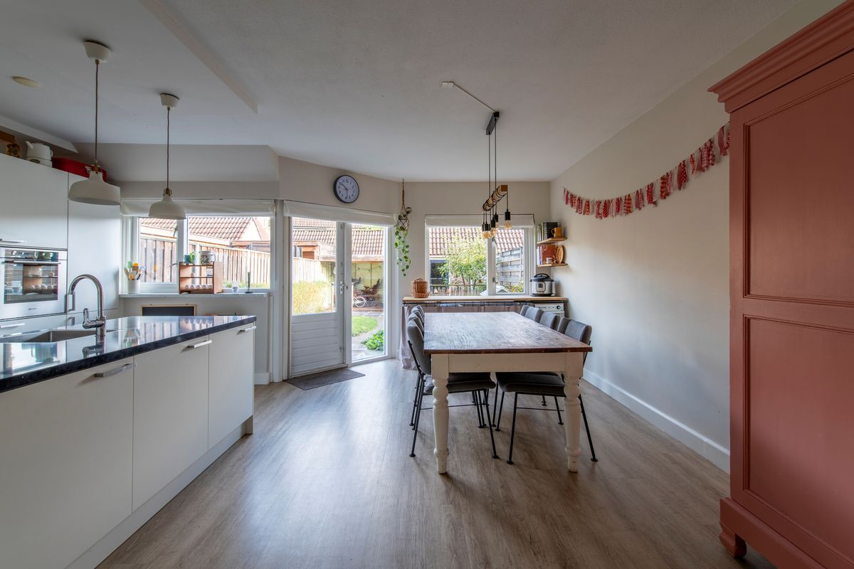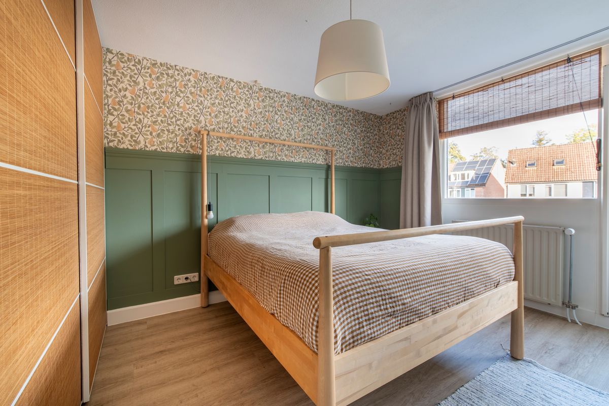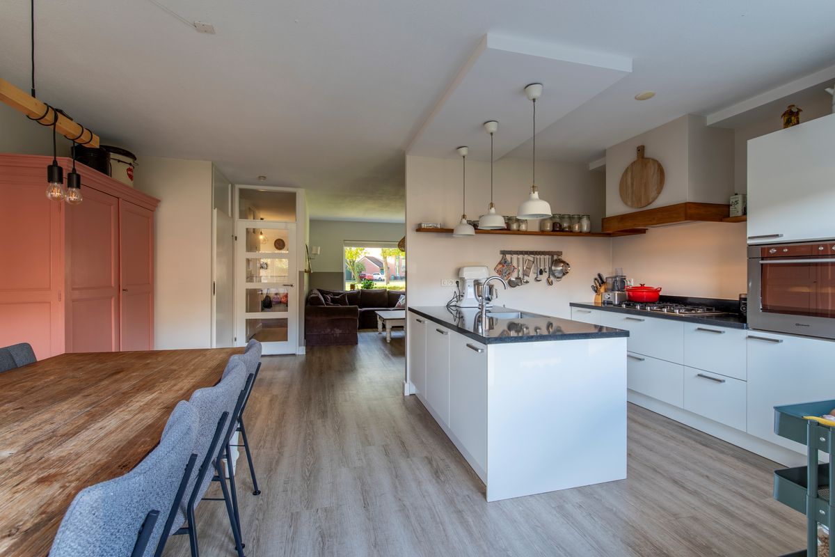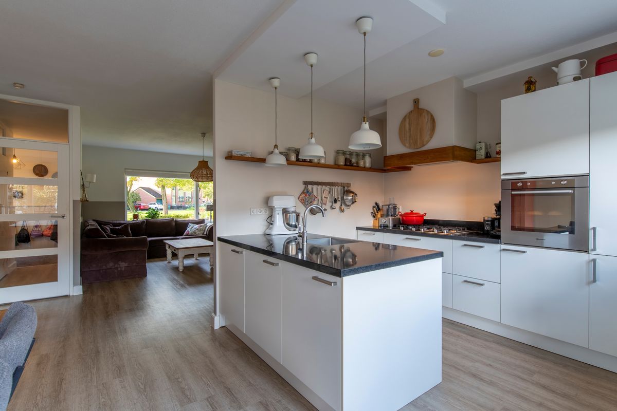 Begane grond: we betreden deze interessante woning via de voordeur. Als eerste bekijken we de royale hal. Hier zien we deuren naar de meterkast en het toilet met een fonteintje. Ook vinden we hier de trap naar de eerste verdieping. De woonkamer is opgedeeld in een riant zitgedeelte aan de voorkant van het huis. Met, we benoemden het al, een leuk vrij uitzicht over een groenstrook. Aan de tuinzijde is er meer dan voldoende ruimte voor een eetkamertafel waar u met uw hele gezin met gemak aan kunt plaatsnemen. Een deur geeft hier toegang tot de achtertuin. De naastgelegen keuken heeft een U-vormige keukeninrichting met witte fronten. Aan inbouwapparatuur is er een 5-pits gaskookplaat, een afzuigkap, een oven, een koelkast, een vriezer en een vaatwasser aanwezig. De hele begane grond is uitgevoerd met vloerverwarming.