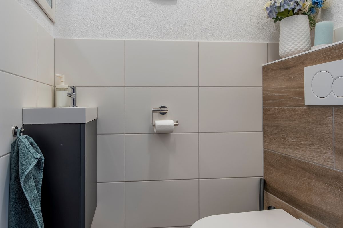 1e Verdieping: Vanaf de overloop zijn allereerst toegankelijk twee slaapkamers aan de achterzijde. De hoofdslaapkamer geeft toegang tot het dakterras. Aan de voorkant ligt de derde slaapkamer en de badkamer. Deze badkamer heeft een ligbad met douchegelegenheid, een toilet en een wastafel met een wastafelmeubel. Ook is de badkamer uitgevoerd met vloerverwarming.