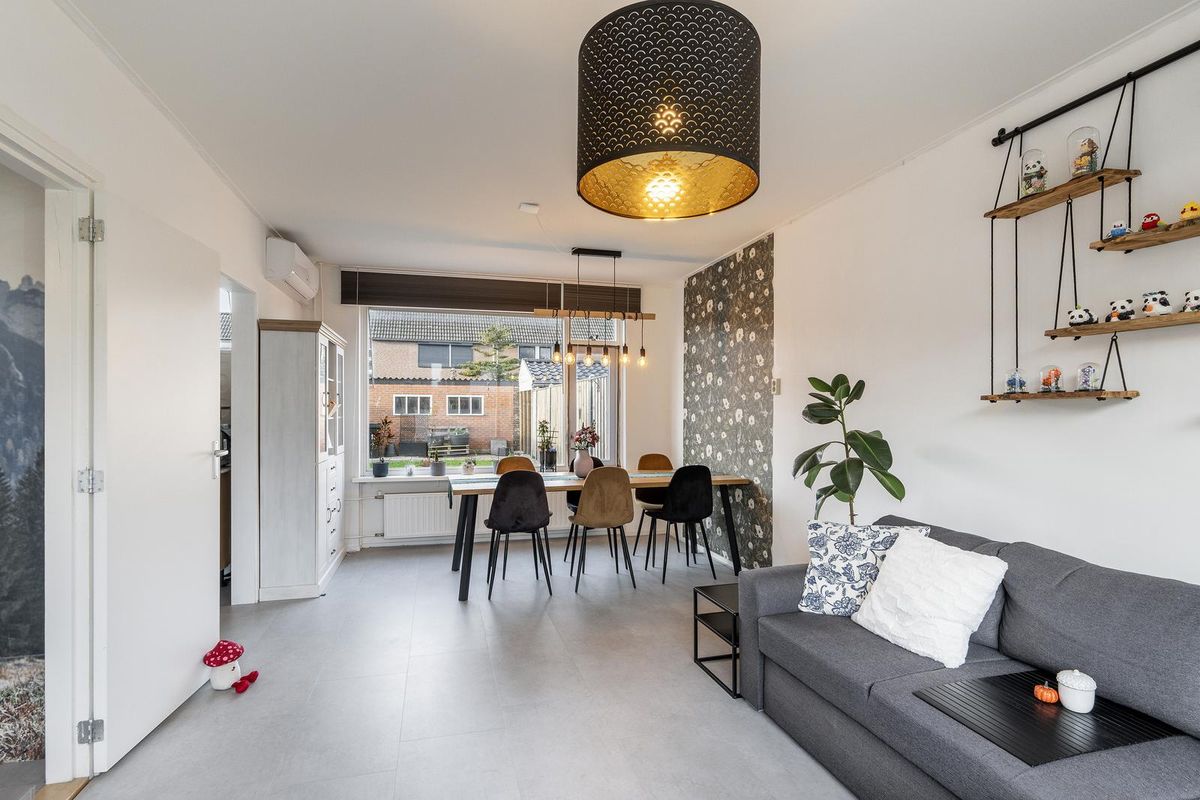 Fijne doorzonwoonkamer met een strakke pvc-vloer, grote raampartijen aan zowel de voor- als achterzijde en een airco voor extra comfort.