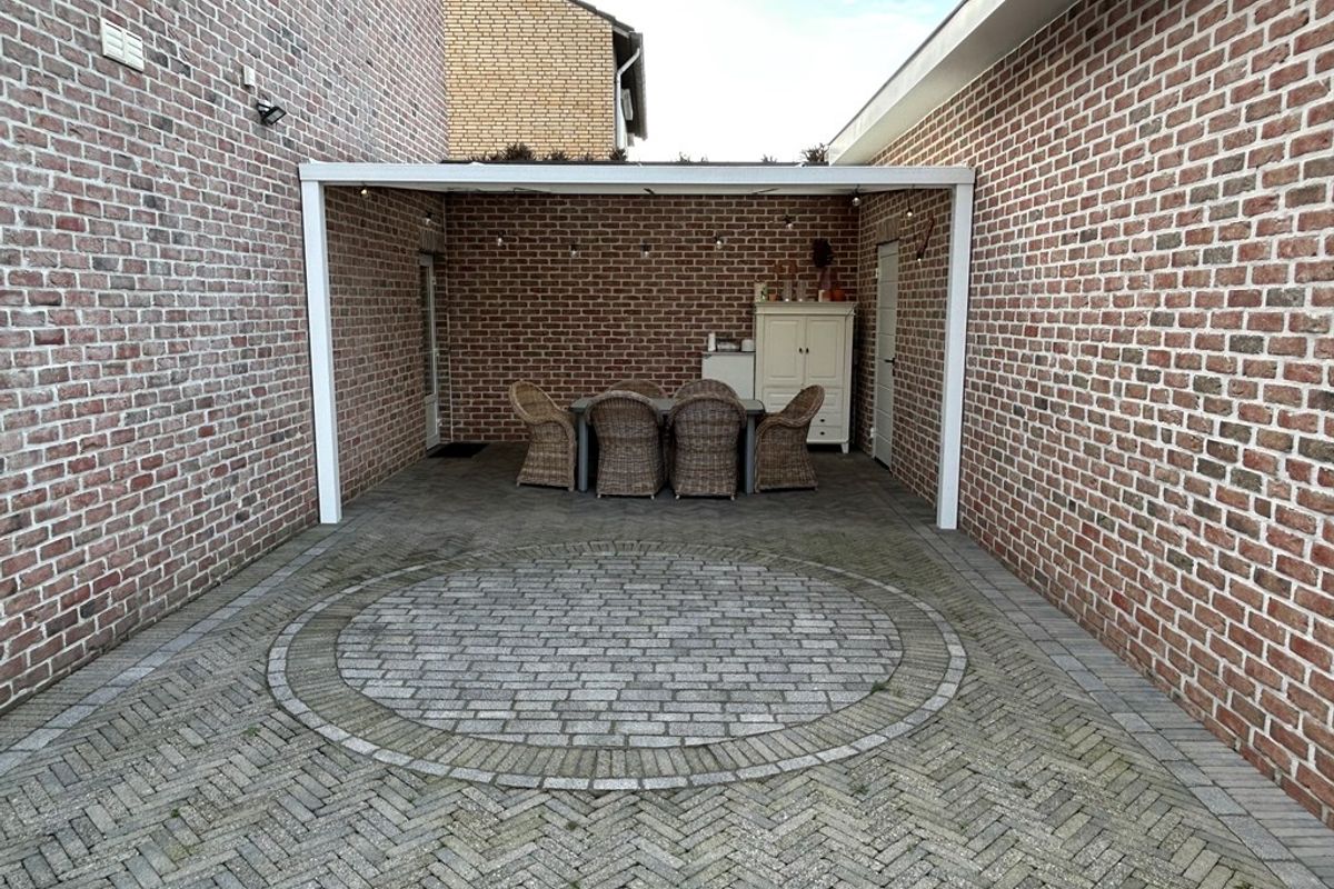 Zij-tuin met bestrating, beplanting, gazon, overkapping 4,55 x 4,05 en oprit 10,40 x 5,40 met afsluitbare poort naar garage/loods.
